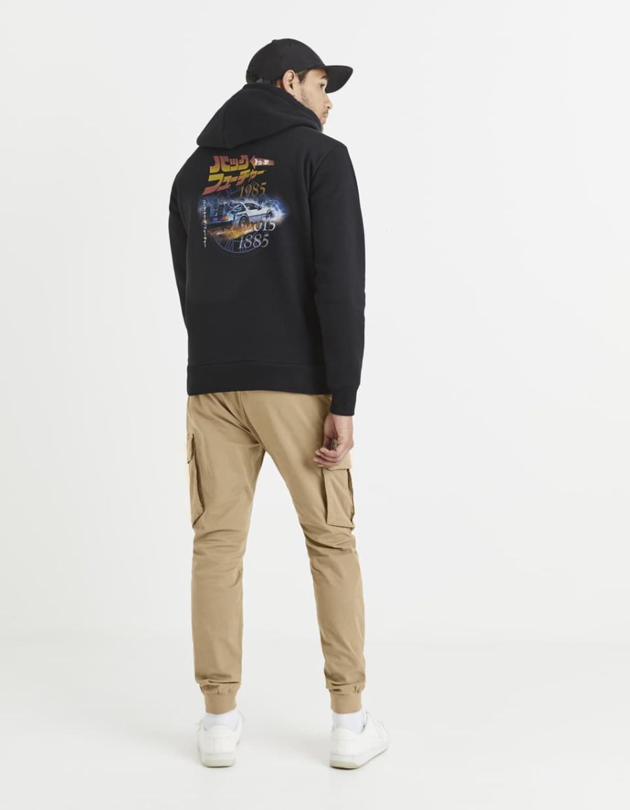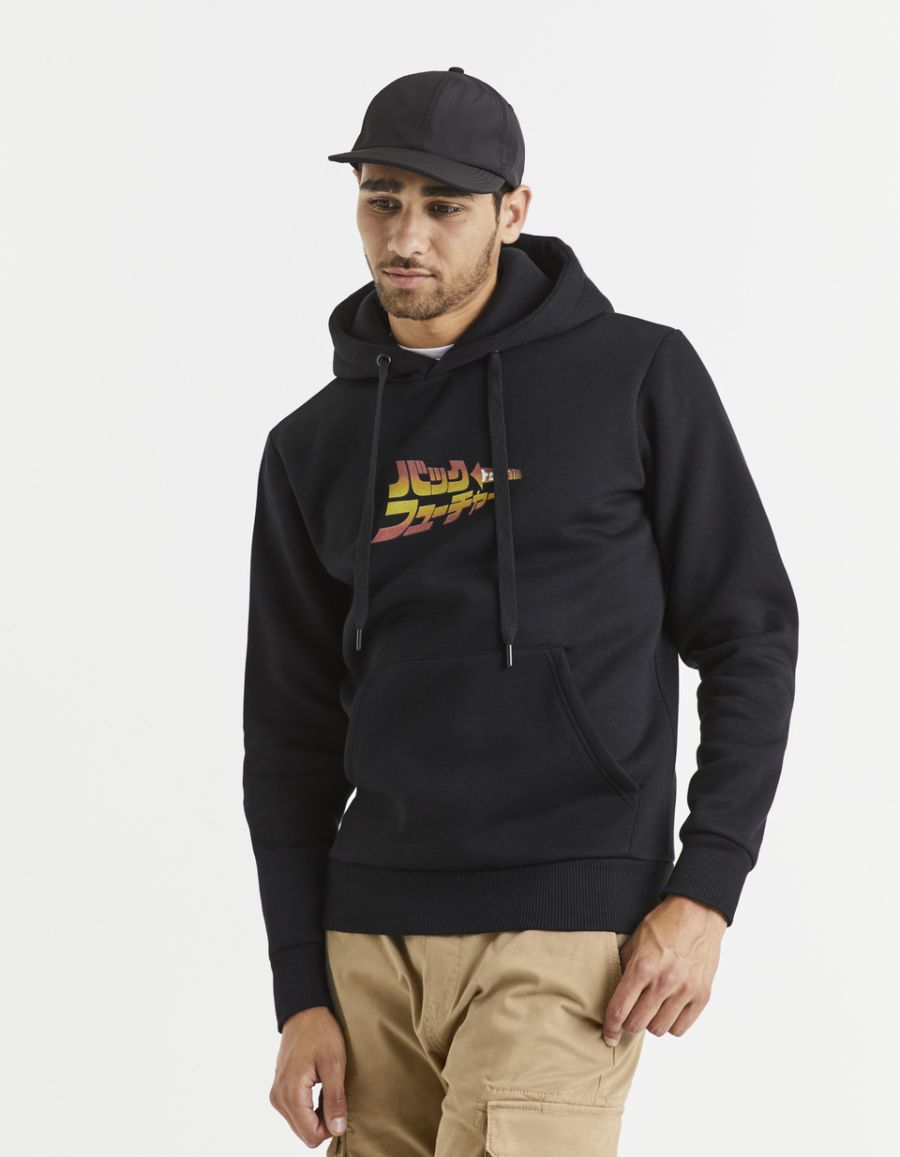 Fan du célèbre film "Retour vers le futur" ? Ce sweat noir pour homme en coton mélangé est fait pour vous ! Il est muni d'une capuche, de manches longues et de deux poches à l'avant. Il sera parfait avec un jean et une paire de baskets.
