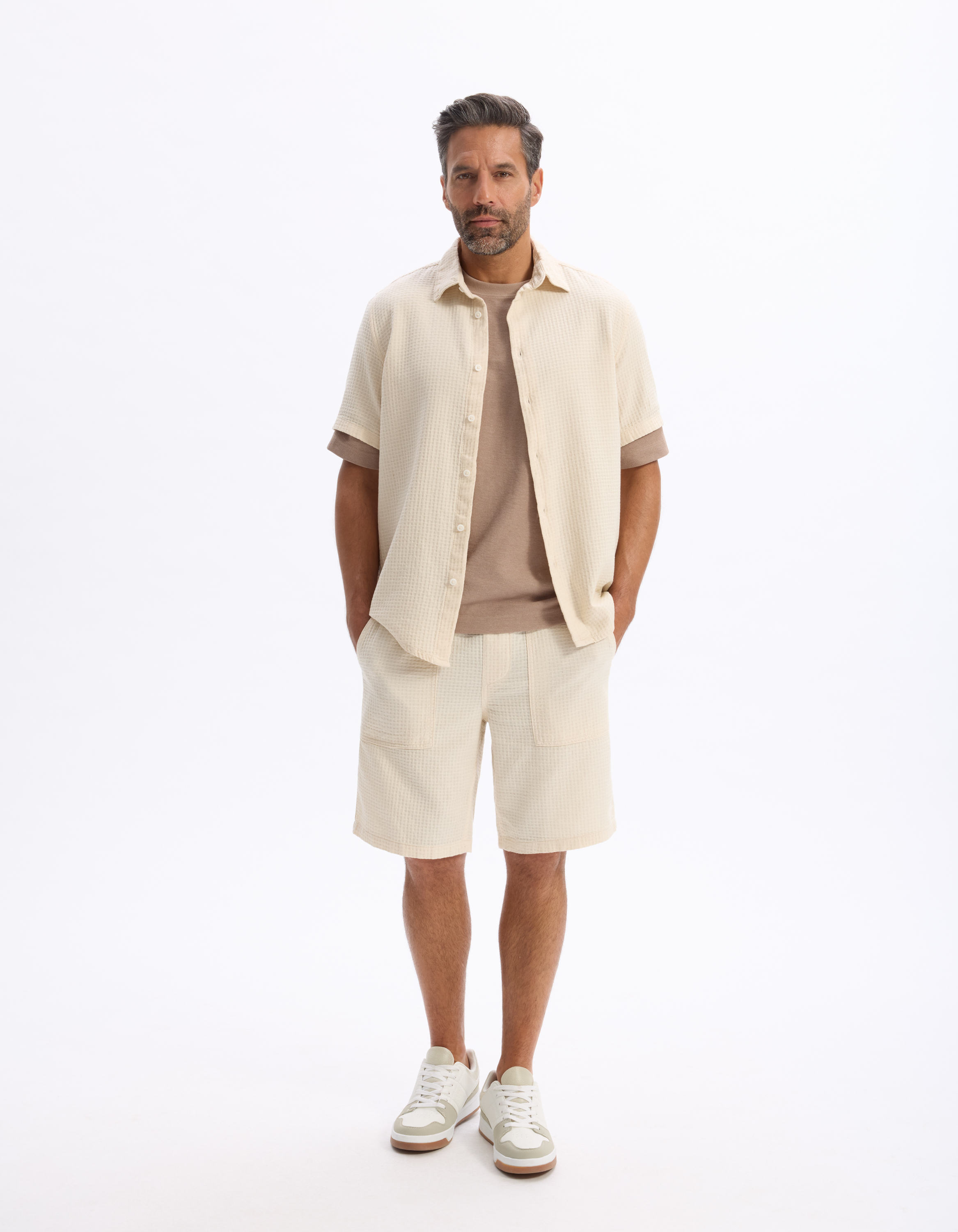 Le style décontracté pour homme à portée de main ! Ce long bermuda beige en tissu gaufré est parfait pour un look à la fois élégant et confortable.