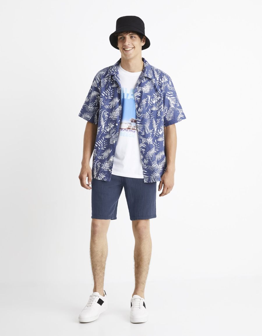 Le tissu 100 % gaze de coton de ce bermuda homme fait tout son confort et sa légèreté. Il est également équipé d'une taille élastiquée avec cordon. Facile à assortir et agréable à porter, il accompagnera très bien une chemise fantaisie ouverte sur un t-sh