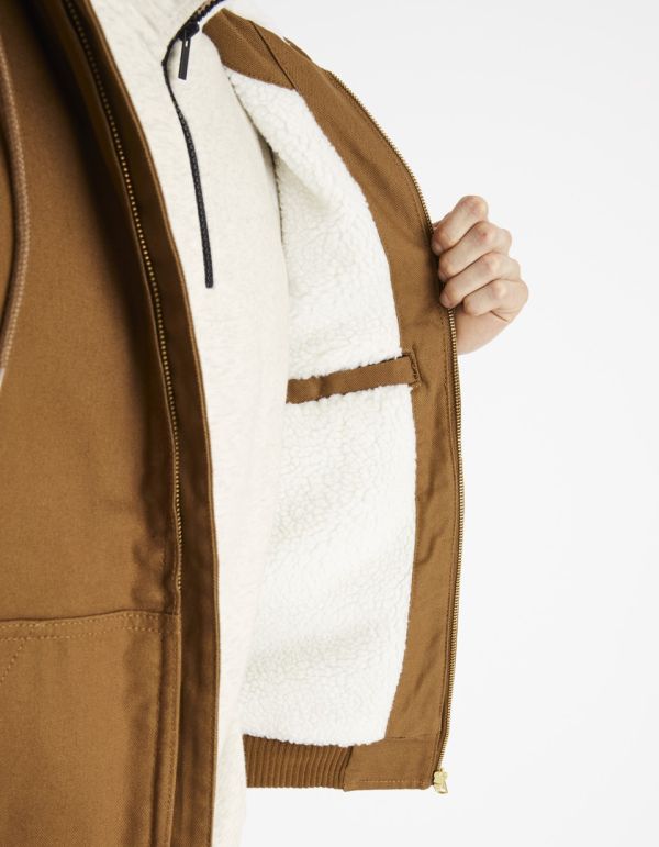 En mode sportswear ou workwear, ce blouson camel pour homme doublé en sherpa conviendra aux journées automnales ou hivernales. Sa fermeture zippée, ses nombreuses poches intérieures et extérieures et sa capuche en sherpa le rend pratique et ultra conforta