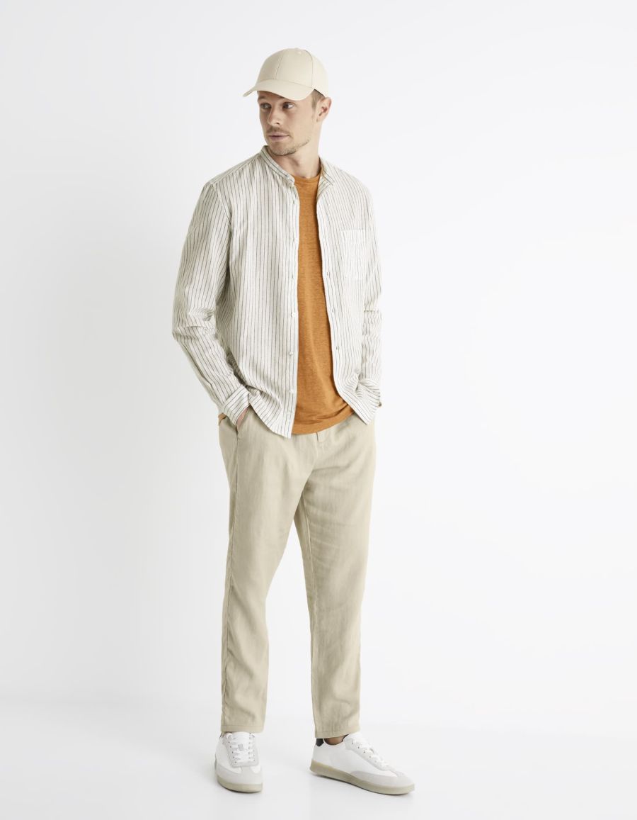 Le col Mao apporte toujours une certaine distinction. Peut-être parce qu'il est moins répandu… Sur cette chemise homme à manches longues, il se marie à de fines rayures, à une poche poitrine et à un tissu 55 % lin et 45 % coton.
