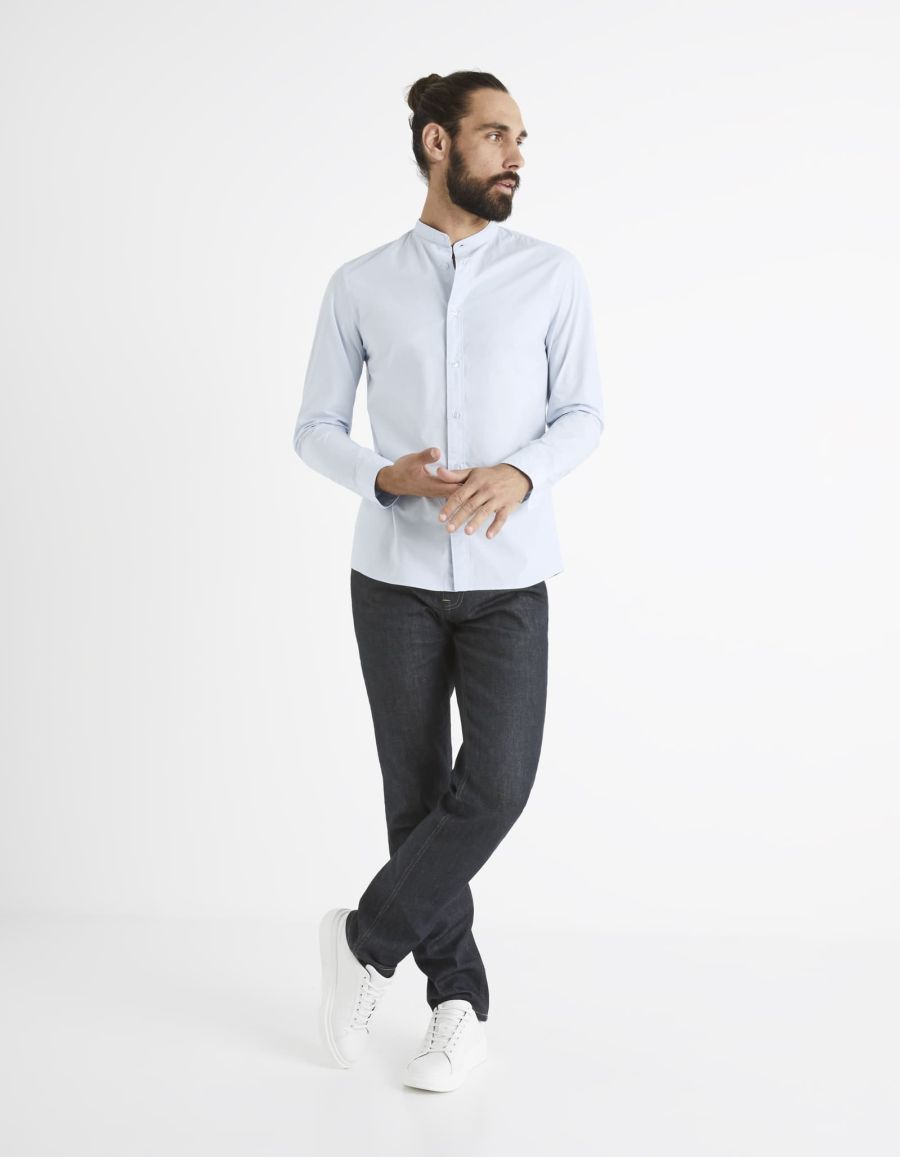 Avoir dans sa garde-robe cette élégante chemise à manches longues bleu ciel est une excellente idée. Ce modèle homme à col Mao, en popeline « craquante », peut en effet être associé à toutes les tenues, habillées ou décontractées. Matière Popeline craquan