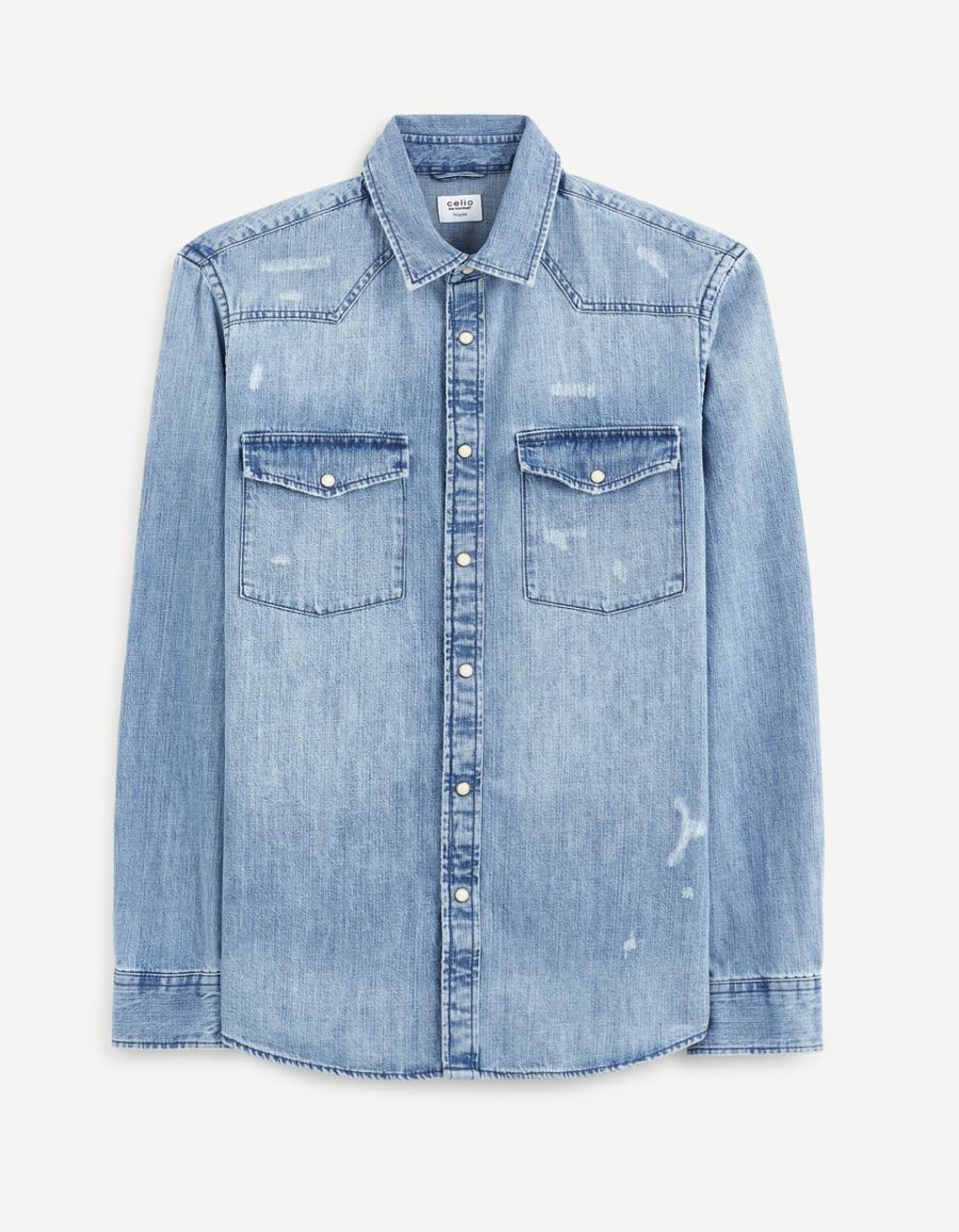 Chemise denim à manches longues, pour homme. L'aspect usé de son tissu bleu clair, 100 % coton, lui confère « le vécu » qui manque généralement aux vêtements neufs. Fermeture à boutons-pressions. Les deux poches poitrine à rabat ferment, elles aussi, grâc