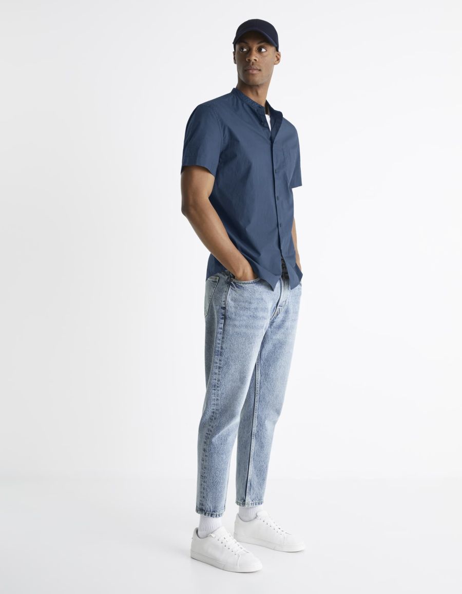 Chemise homme manches courtes en tissu léger et confortable, 100 % coton. Sa couleur marine, son col Mao et sa poche poitrine lui confèrent élégance et sobriété. Elle se marie aussi bien à une tenue décontractée qu'à un ensemble habillé.