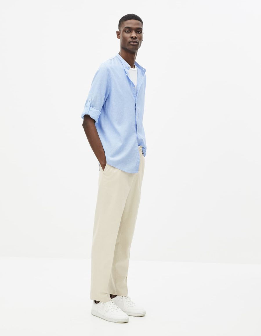 Chemise pour homme en lin et coton avec un col mao et un imprimé à fines rayures. Les manches longues ont un bouton qui permet de facilement les retrousser. Vous porterez cette chemise ouverte sur un t-shirt, dans un esprit casual cool.