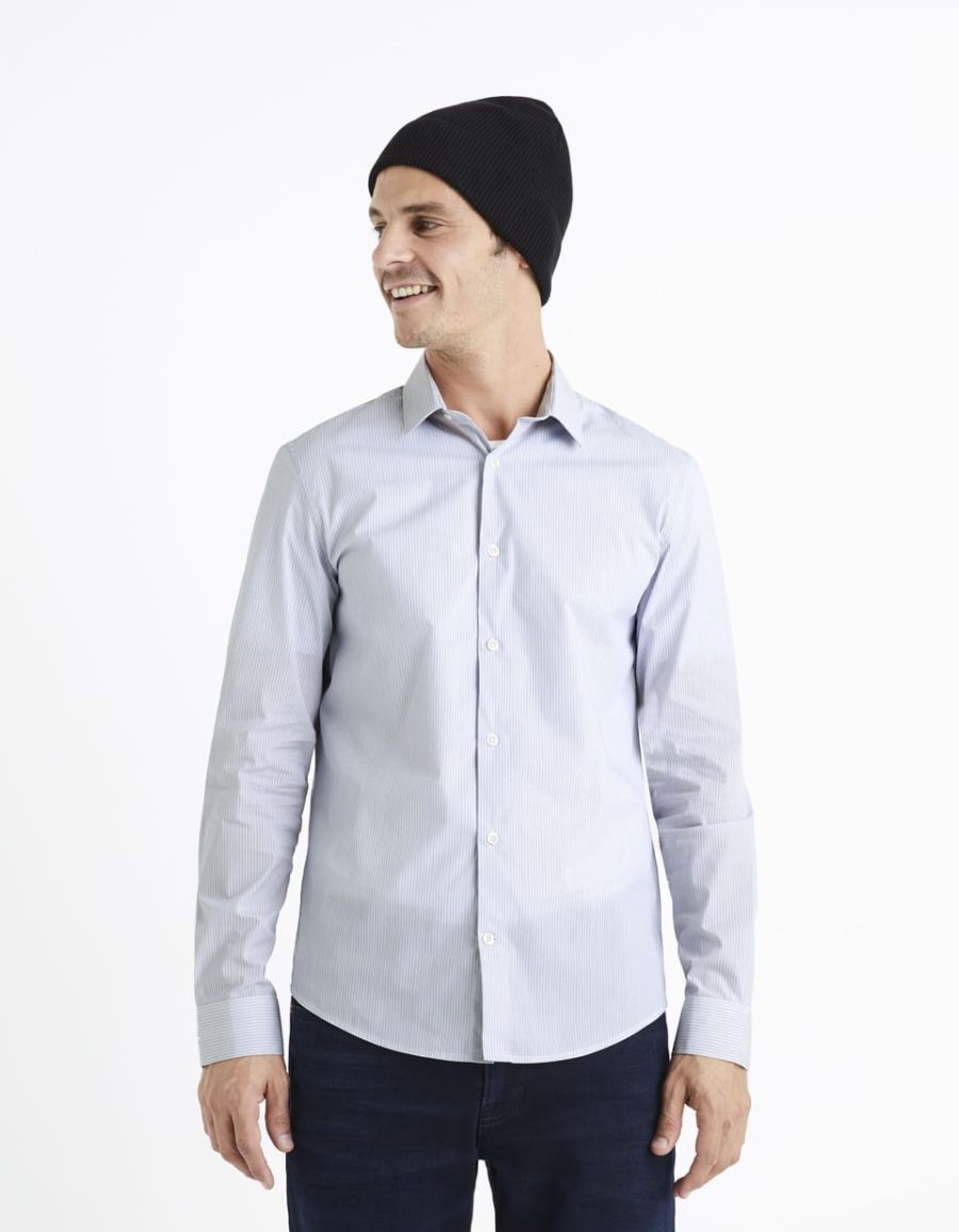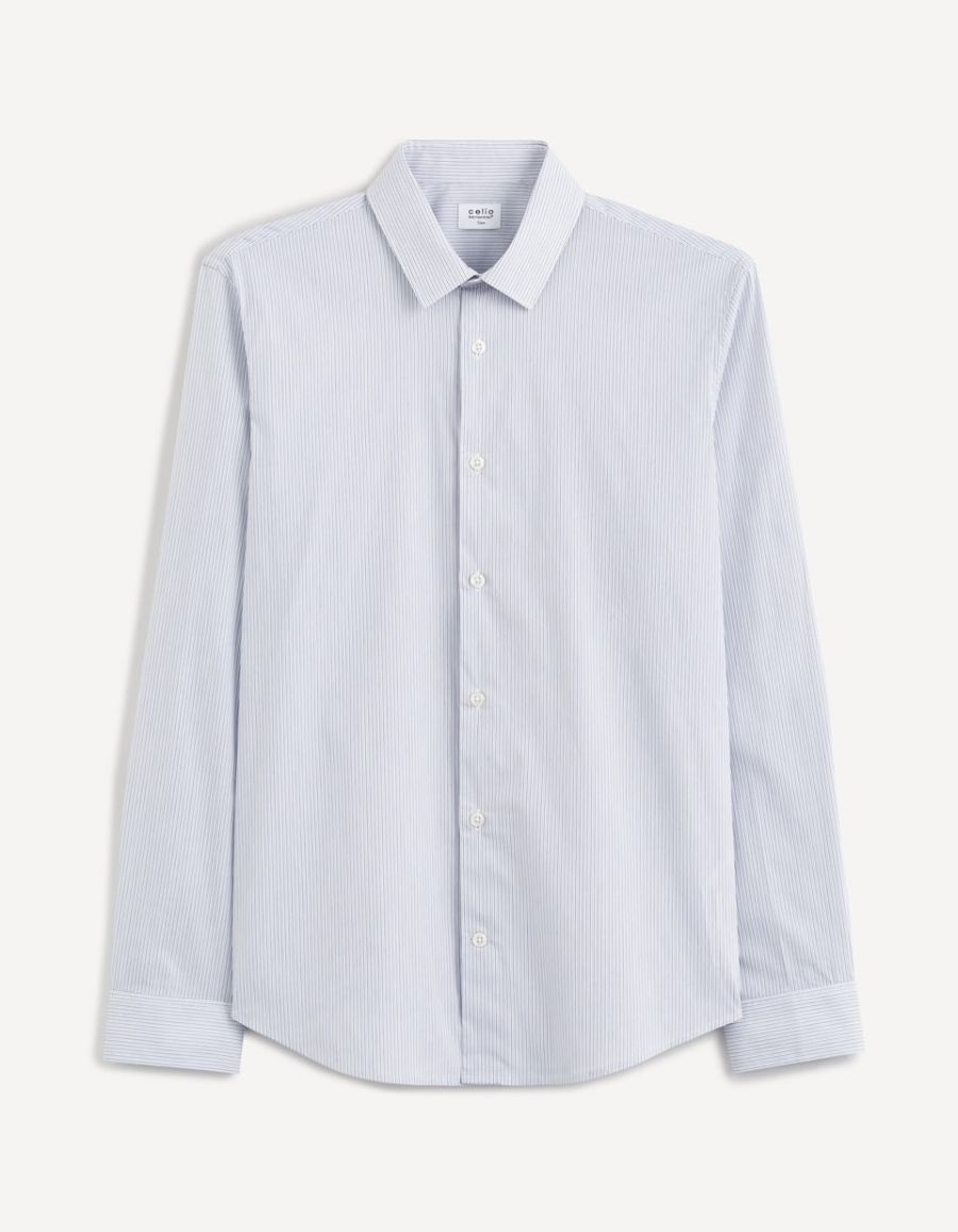 Le motif discret de cette chemise homme accompagnera très bien un costume pour un maximum d'élégance. Son tissu rayé bleu est en coton mélangé stretch avec un traitement Easy Iron qui facilite le repassage. La coupe est slim, avec un col français.