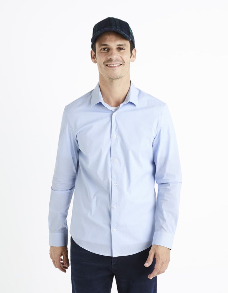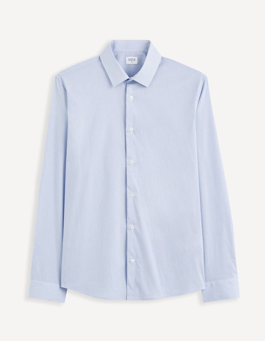 Le motif discret de cette chemise homme accompagnera très bien un costume pour un maximum d'élégance. Son tissu est en coton mélangé stretch avec un traitement Easy Iron qui facilite le repassage. La coupe est slim, avec un col français.