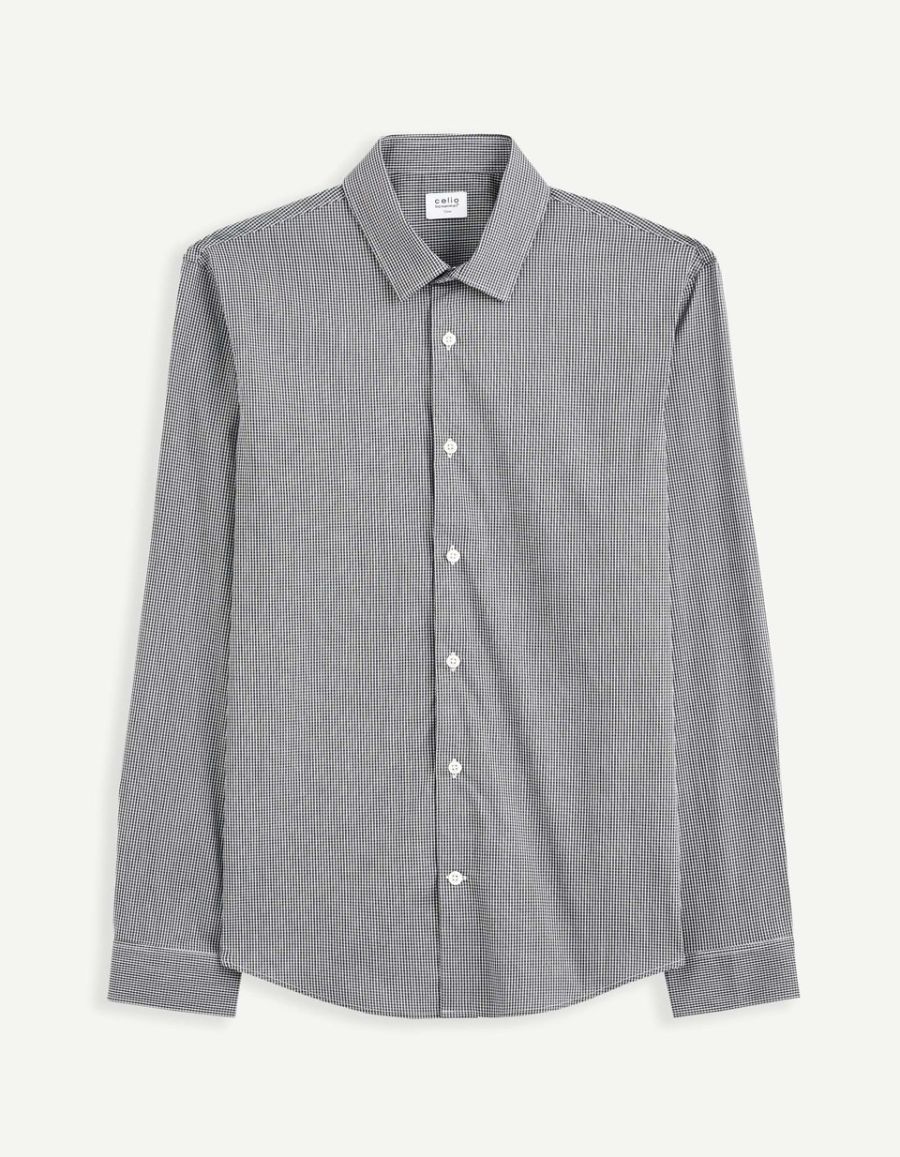Le motif discret de cette chemise homme accompagnera très bien un costume pour un maximum d'élégance. Son tissu est en coton mélangé stretch avec un traitement Easy Iron qui facilite le repassage. La coupe est slim, avec un col français.