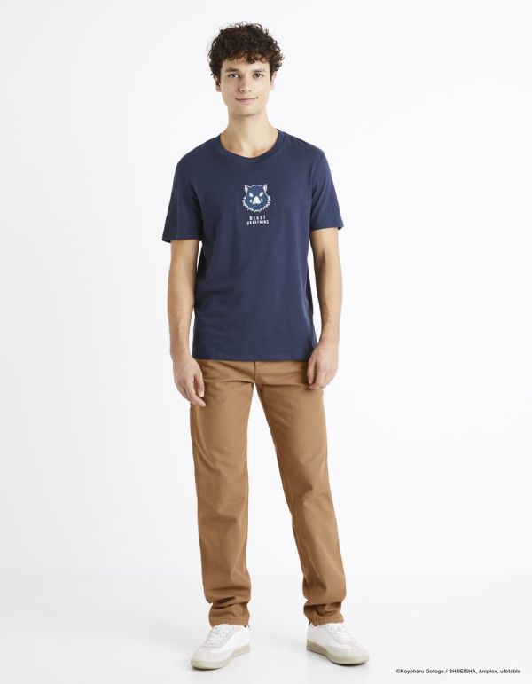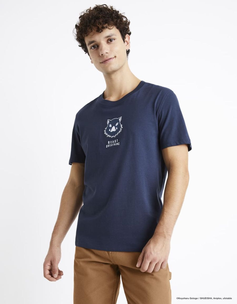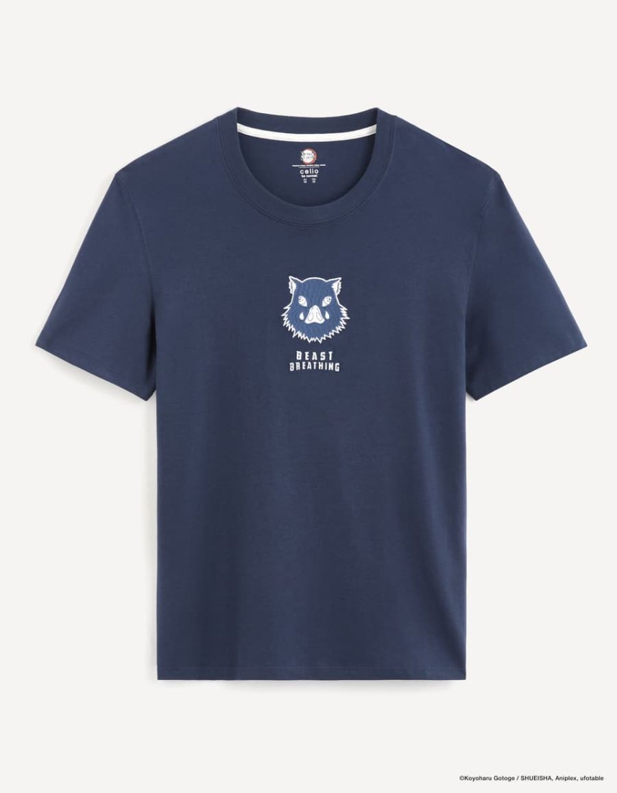 L'animé cultissime Demon Slayer: Kimetsu no Yaiba débarque chez celio pour une collection spéciale ! Pas de jaloux : chaque héros a son tee-shirt dédié avec ses couleurs signatures. Le pourfender à tête de sanglier est la star de ce t-shirt bleu marine. C