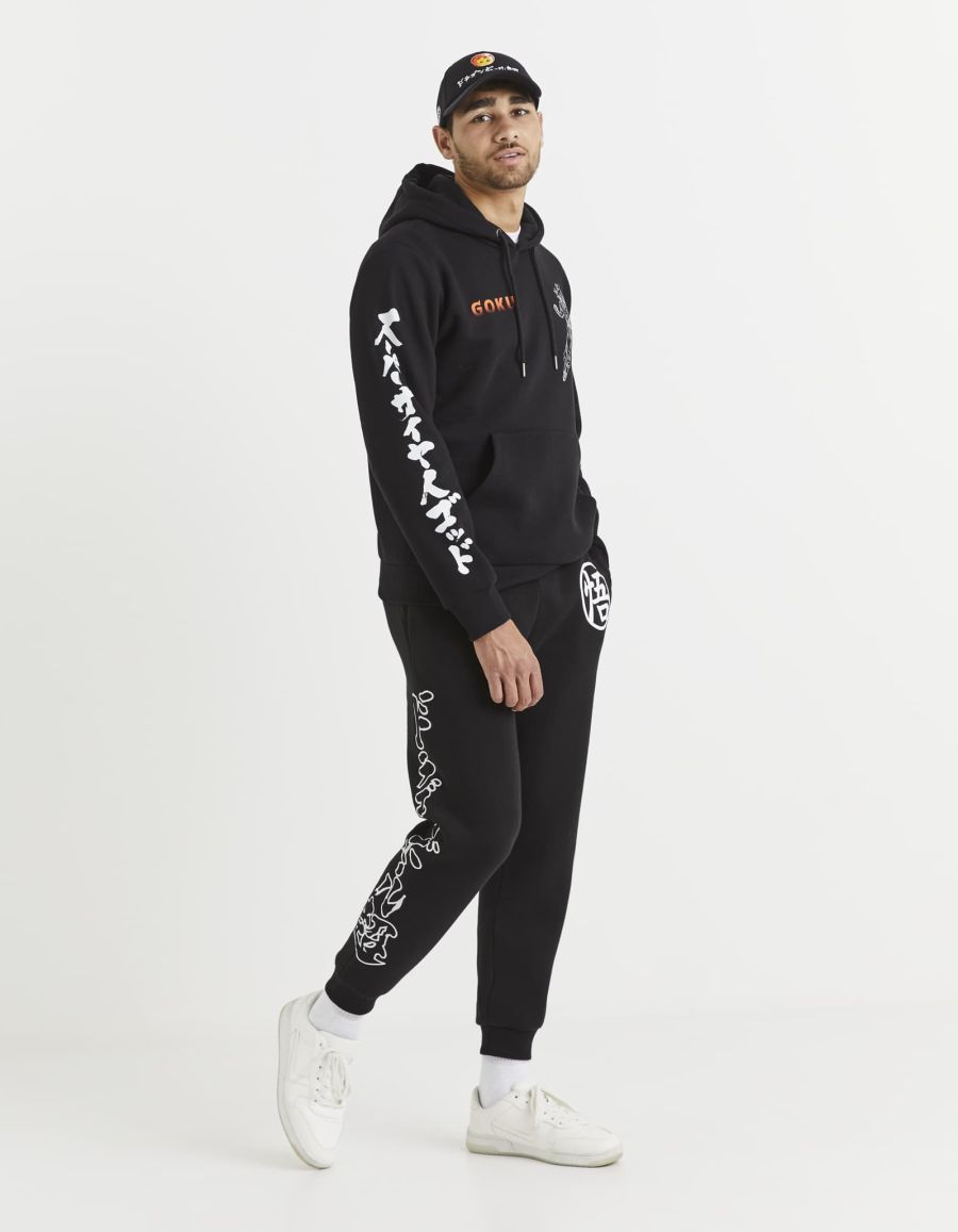 Sur ce jogging noir pour homme en coton mélangé, nous retrouvons le kanji de Goku ainsi que le nom Dragon Ball Super écrit en japonais sur le côté. Il a une taille élastiquée, un cordon de serrage et des poches sur les côtés.