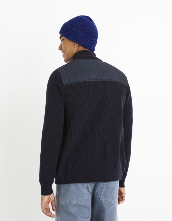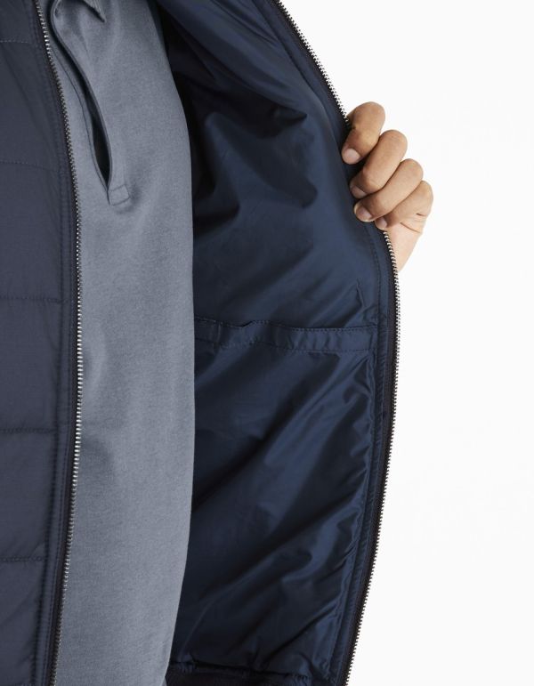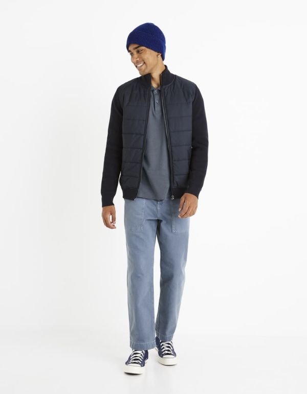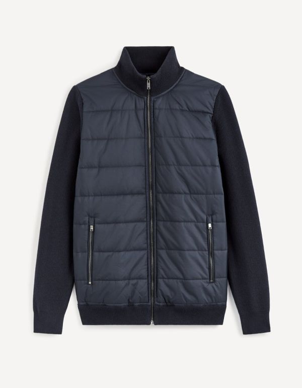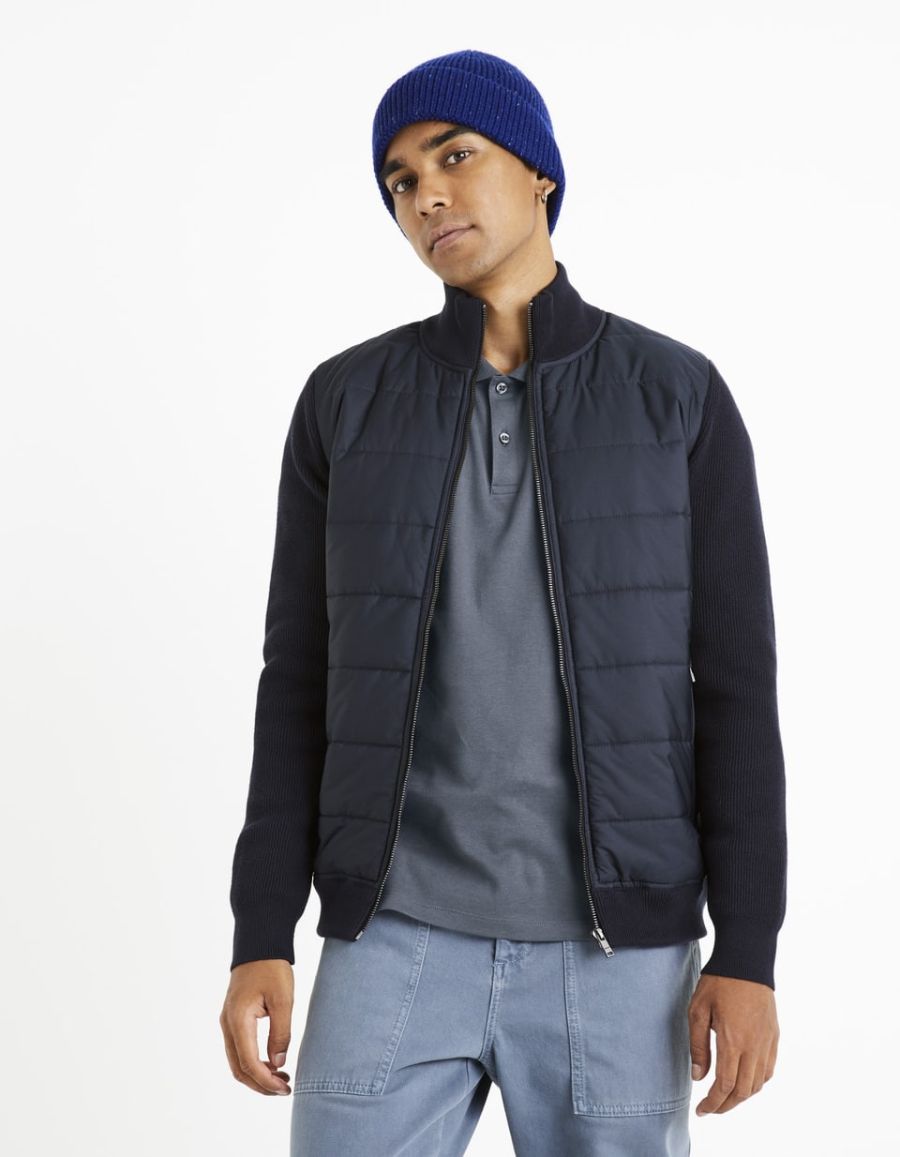 Cette veste marine pour homme est le blouson de toutes les saisons. Sa conception en bi-matières avec son corps matelassé fait de ce vêtement une promesse de confort et de chaleur. Il se porte avec quasiment tous les types de pantalons.