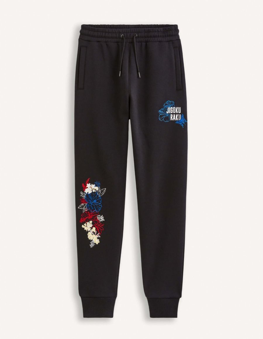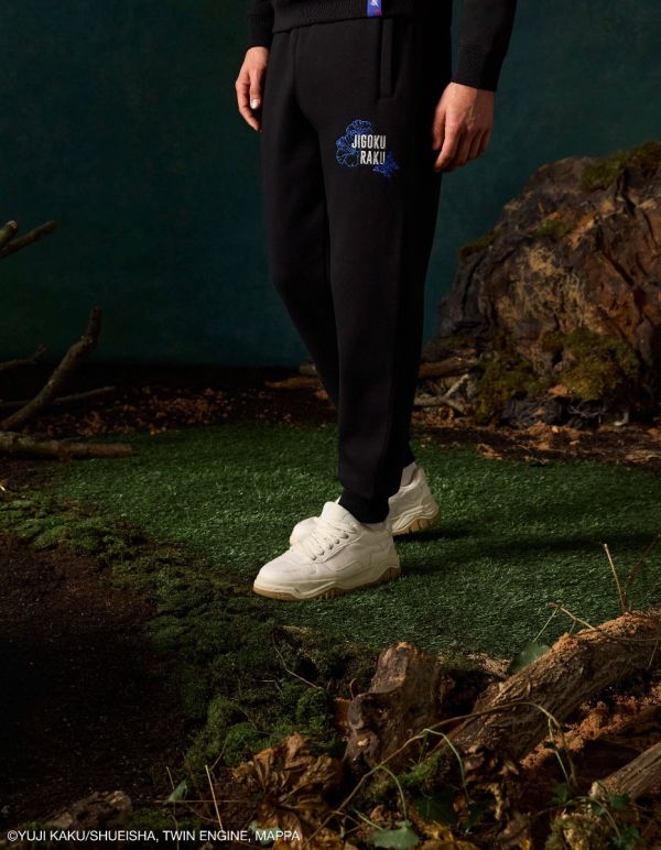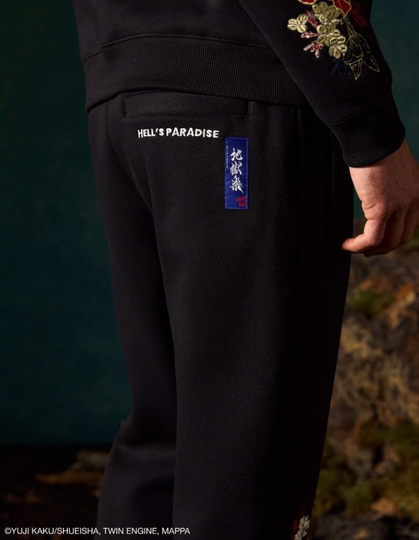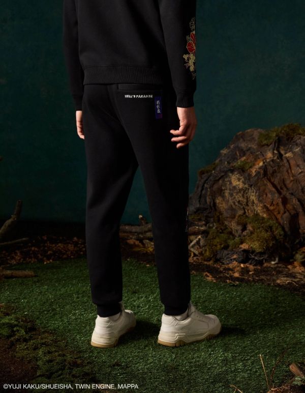 HELL'S PARADISE, manga japonnais sous le nom de JIGOKURAKU, raconte l'histoire de Gabimaru, « Le Vide », le plus célèbre et puissant des ninjas-assassin, un shinobi formé à l'art du ninjutsu. Jogging noir pour homme, sur le devant nous retrouvons les fleurs brodés du manga, parfait avec son jogging noir.