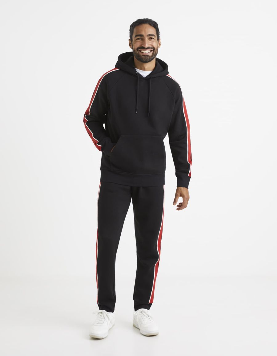 Adoptez le look unique de ce jogging avec bandes couleur, que vous porterez aussi bien avec un sweat qu'un t-shirt. Ce jogging pour homme est équipé d'une taille élastiquée avec cordon de serrage. Son tissu est en coton mélangé.