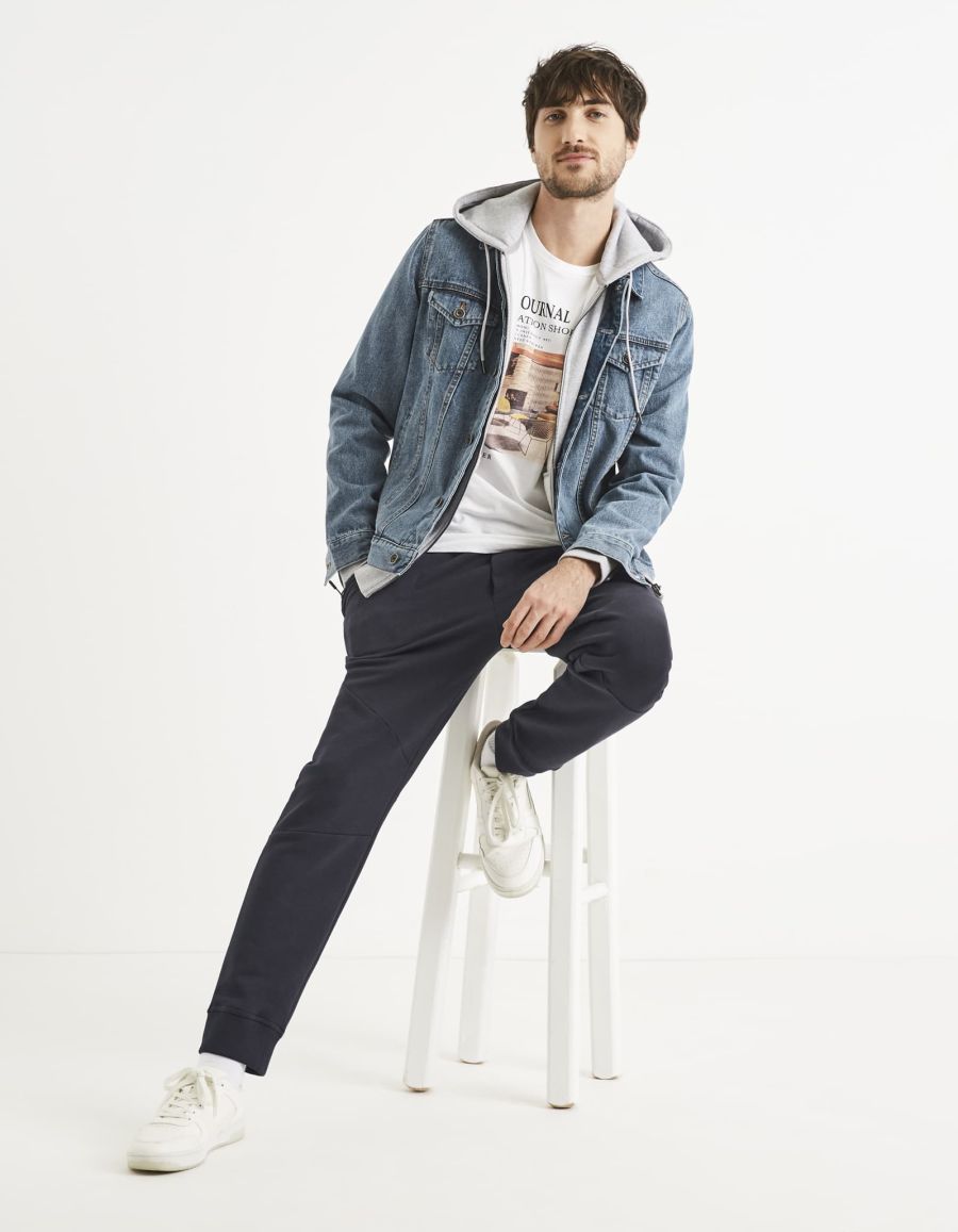 Joggigng en maille, poche devant zippée. Détail de ceinture élastiquée Détail de découpe sur le devant Taille élastiquée avec lien ajustable et bas de jambes reserrées