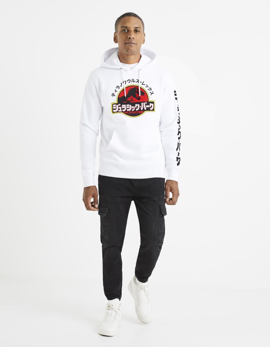 Ce sweat blanc pour homme en coton mélangé devrait ravir tous les fans de Jurrassic Park ! Il possède une capuche avec cordon de serrage, des manches longues et une poche ventrale. Il ira parfaitement avec un jean ou un jogging noir et une paire de basket