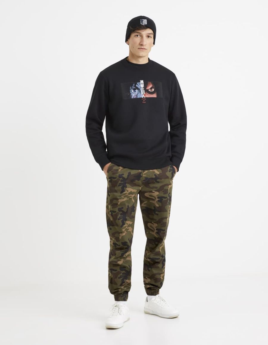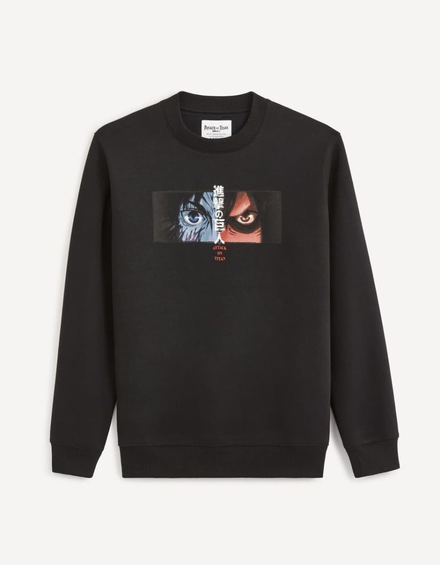 Lorsque Eren dévoile ses pouvoirs, il se transforme en un titan surpuissant, également connu sous le nom de Titan Assaillant (Shingeki no Kyojin en version originale). C'est lui qui est représenté à l'avant de ce sweatshirt à col rond noir, avec le logo d