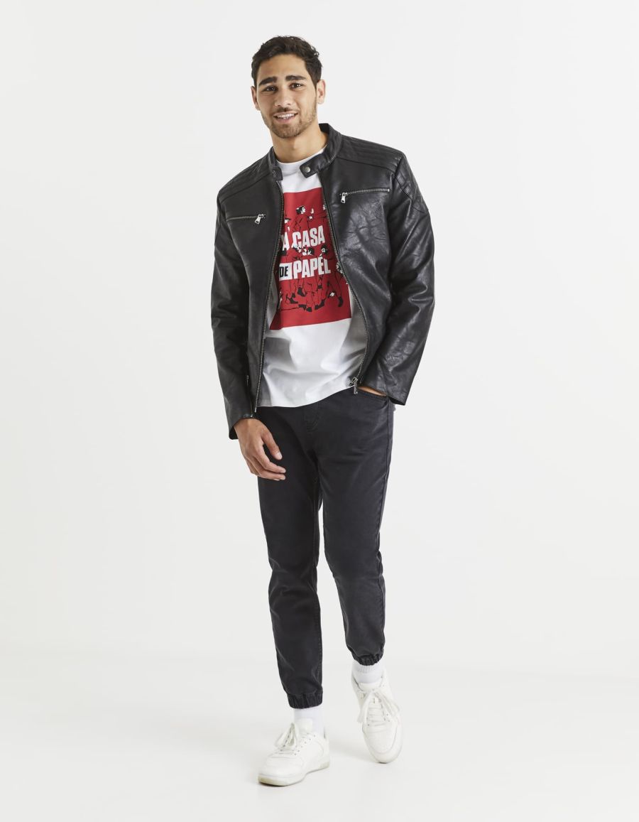 Ce t-shirt pour homme 100% coton met en avant les braqueurs de la série, habillés de leur célèbre combinaison rouge et accompagnés du professeur. Il possède un col rond et des manches courtes.