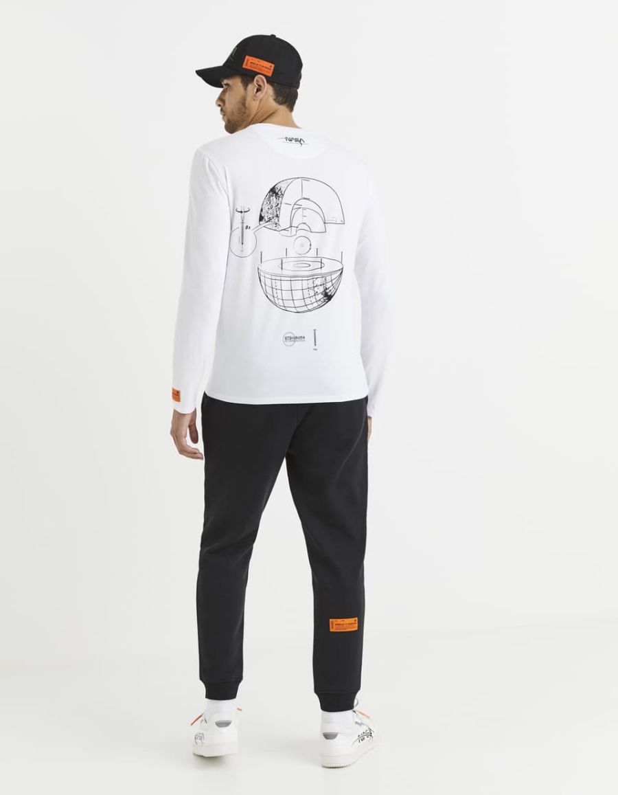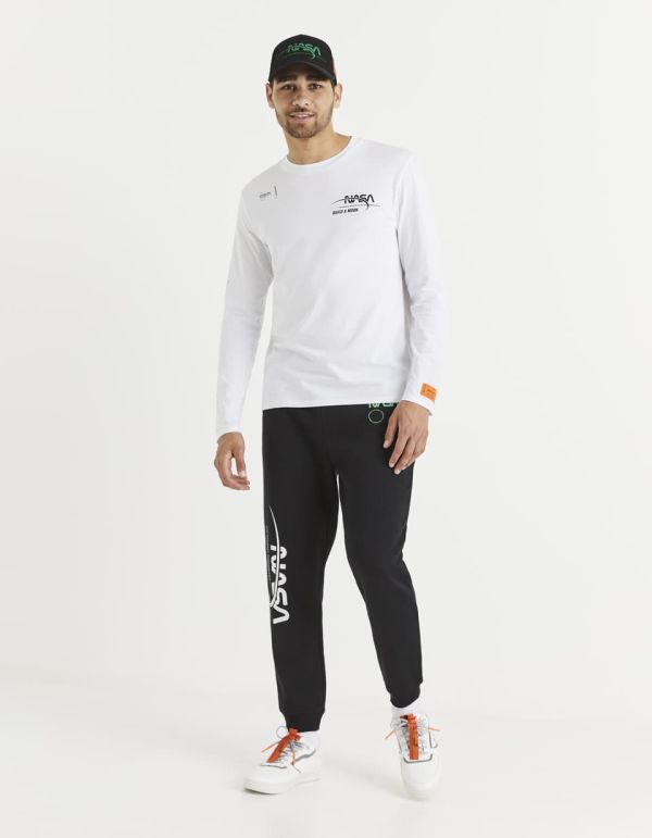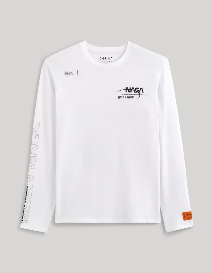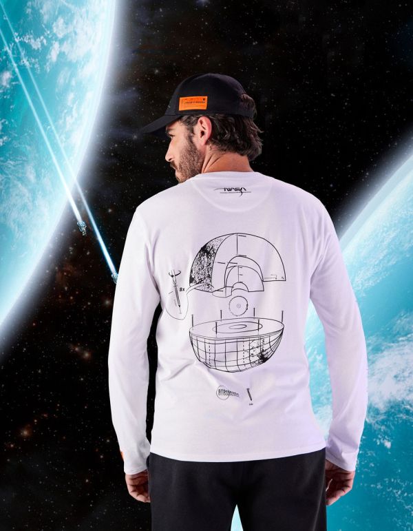 Ce t-shirt blanc NASA pour homme 100% coton possède des manches longues et un col rond. Au dos est représentée la STScI - AURA Astronomy avec la Lune, à construire. Sur la manche l’inscription "Moon Walk" est doublement visible.