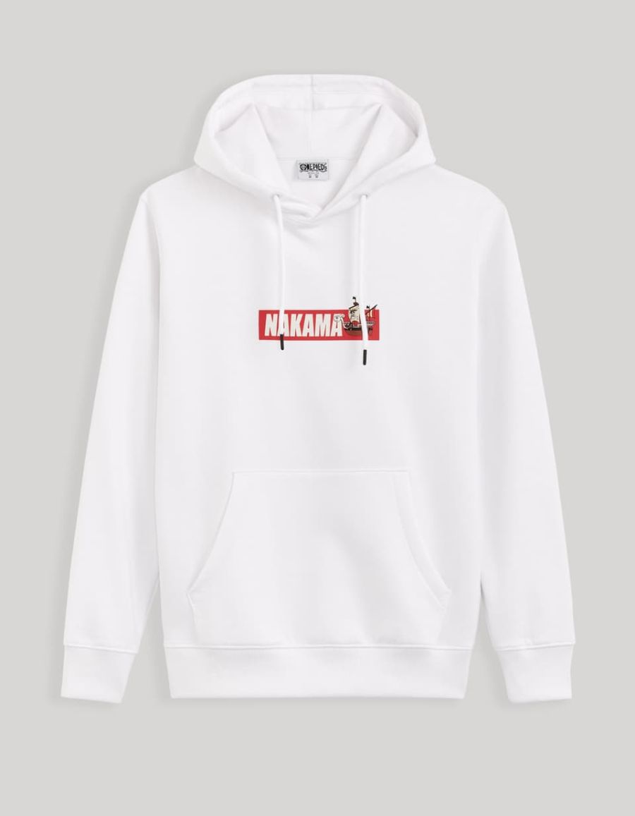 Ce sweatshirt blanc affiche la mention Nakama sur une petite bande rouge à l’avant. Ce terme peut être traduit par “compagnon” ou encore “camarade”. Il est souvent utilisé par Luffy pour parler des membres de son équipage ! On y retrouve également son pre