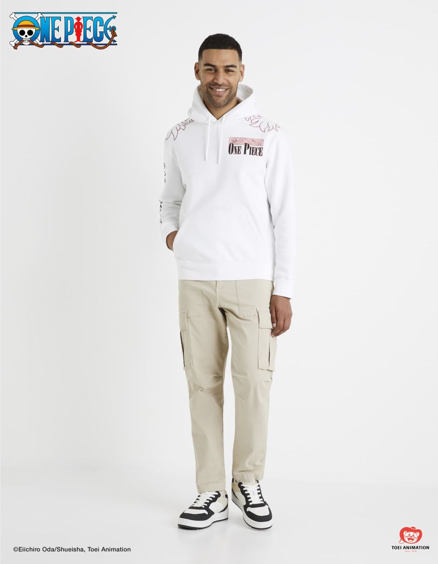 Le manga le plus connu au monde débarque chez celio, découvrez nos nouveaux produits One Piece.Sweat blanc pour homme, représentation du mercenaire de guerre Doflamingo dans le dos, inscription "One Piece" au niveau du c?ur. Inscription en japonais sur la