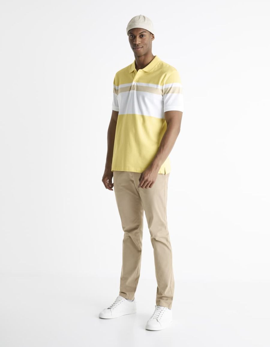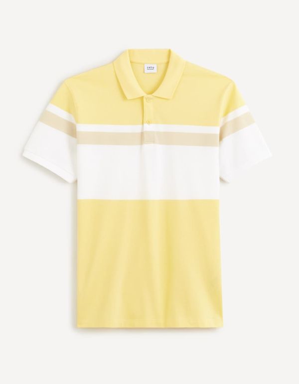 Confectionné dans un tissu 100 % coton piqué, ce polo homme à manches courtes respecte la tradition. C'est dans ce tissu qu'a été fabriqué le premier polo, il y a un siècle environ. Son coloris, jaune et blanc, est en revanche plus original.