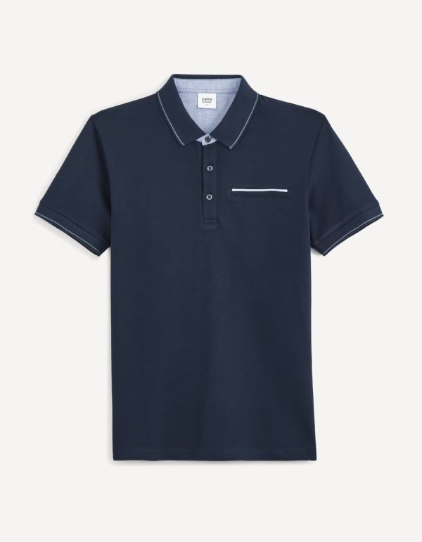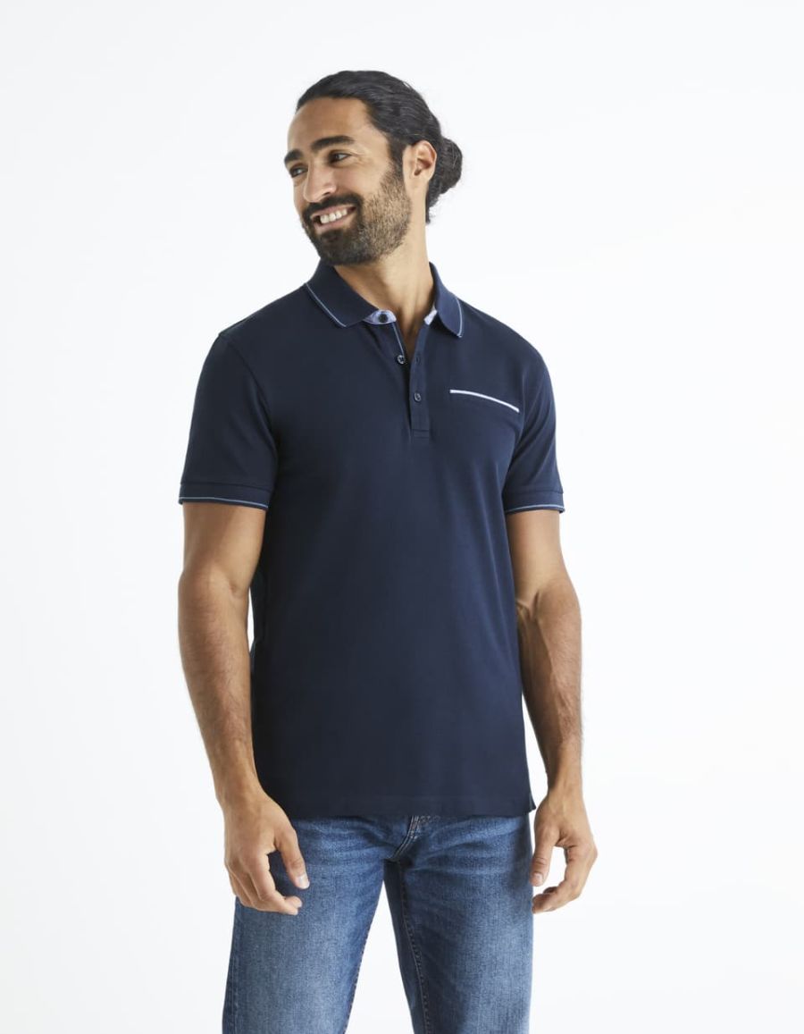 Polo homme preppy uni, coupe slim. Col fantaisie avec patte de boutonnage contrastée, manches courtes. Tissu piqué à maille fine et légère. Poche poitrine plaquée. Polo celio en 100% coton. Le plus produit : la finition contrastée sur la bordure de poche.