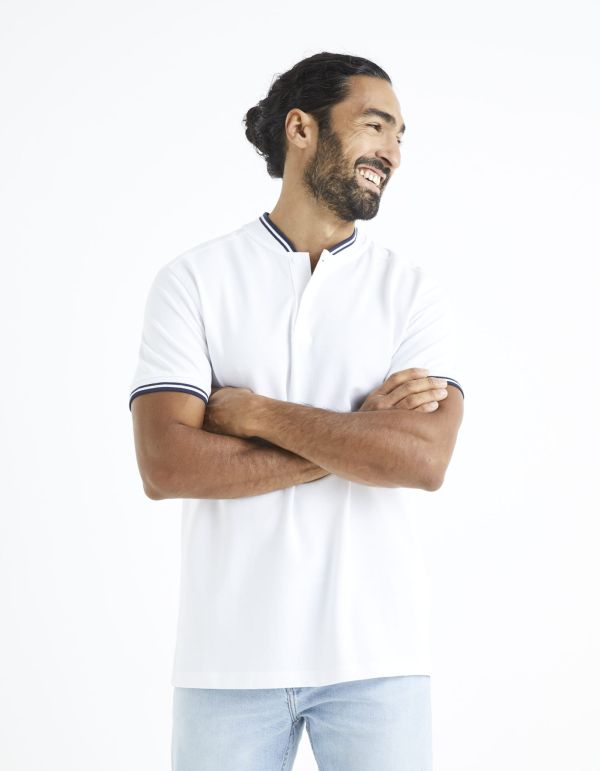 Ce polo piqué pour homme 100% coton est conçu avec une encolure bomber au lieu d’un col traditionnel. Il possède des manches courtes, une patte de boutonnage à deux boutons et un double liseré sur les manches et le col. Ce polo se distingue par sa légèret