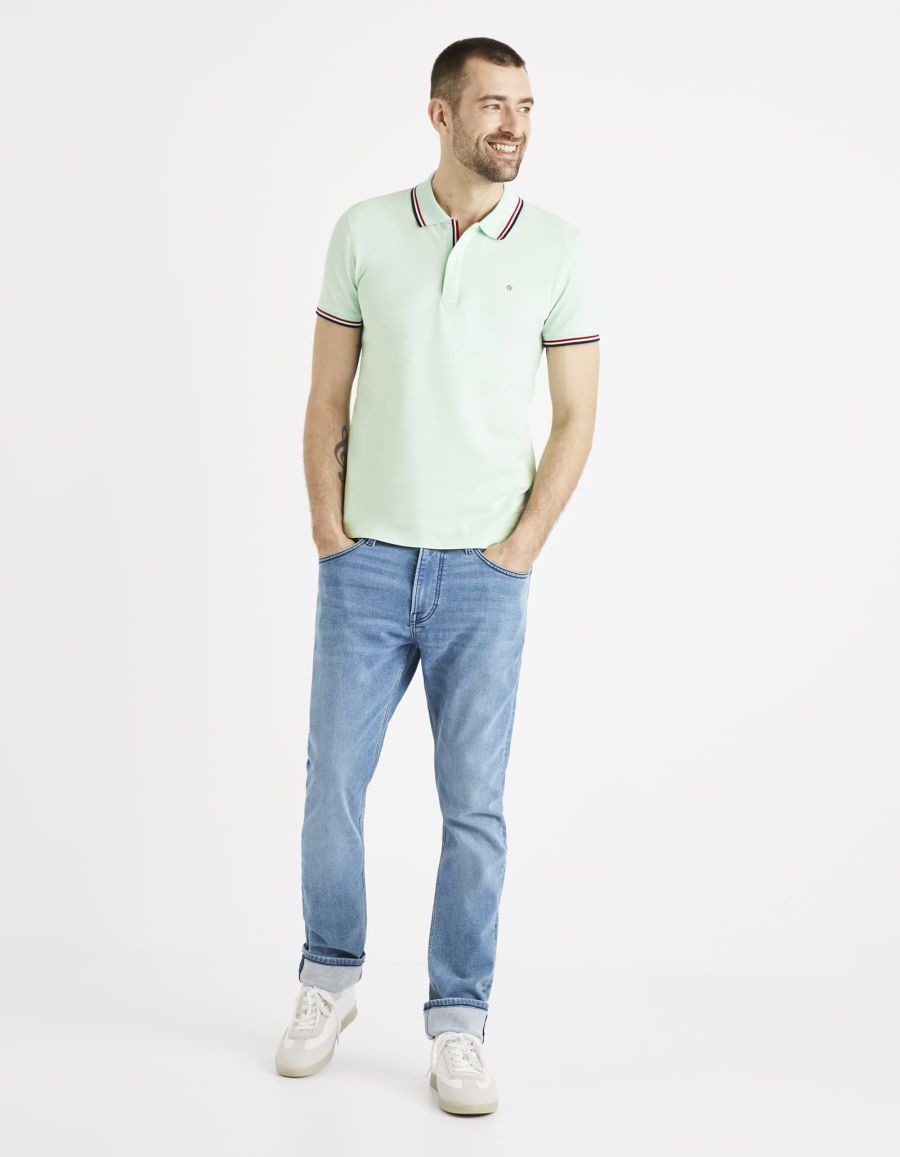 Ce polo piqué slim à manches courtes en coton supima extensible joue sur la tendance, avec ses rayures tricolores en liseré des manches et du col. Le logo brodé sur la poitrine offre une finition élégante. Associez-le à un pantalon droit et des derbies po
