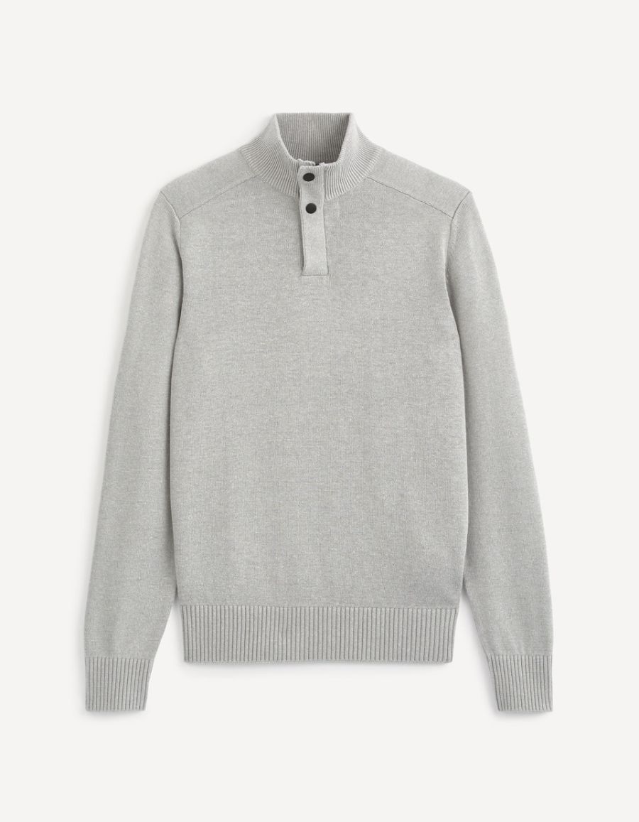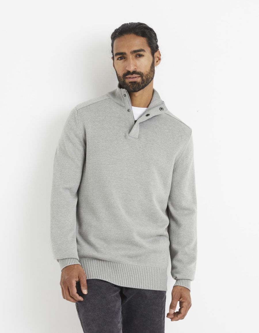 Le col montant de ce pull pour homme a des boutons pression ainsi qu'un zip caché. Vous pourrez le porter ouvert sur un t-shirt, ou tout simplement fermé, avec un jean. La maille est en coton mélangé.