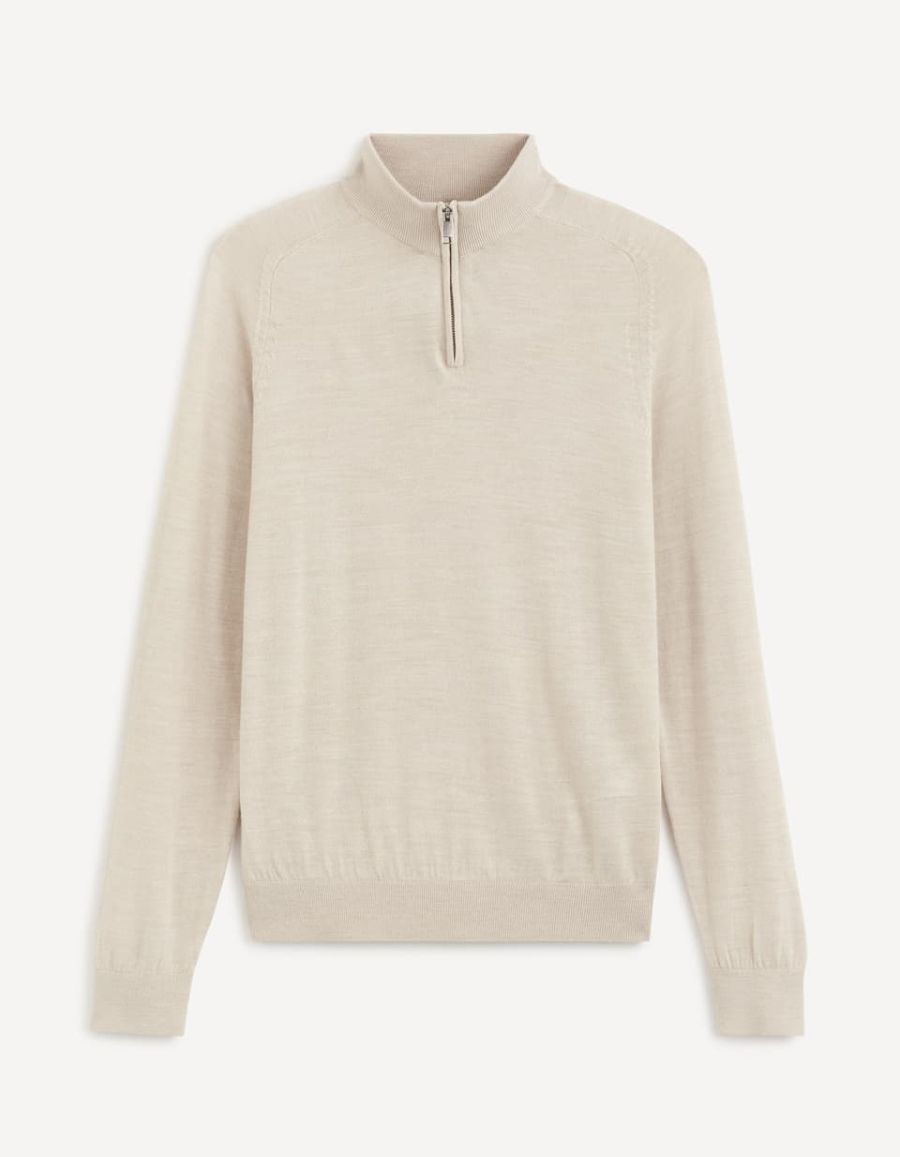 Pull col montant zippé laine merinos mélangée - ecru