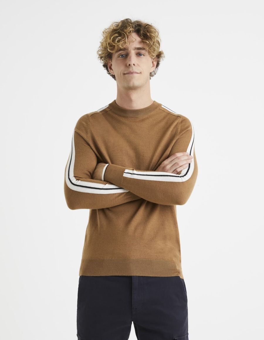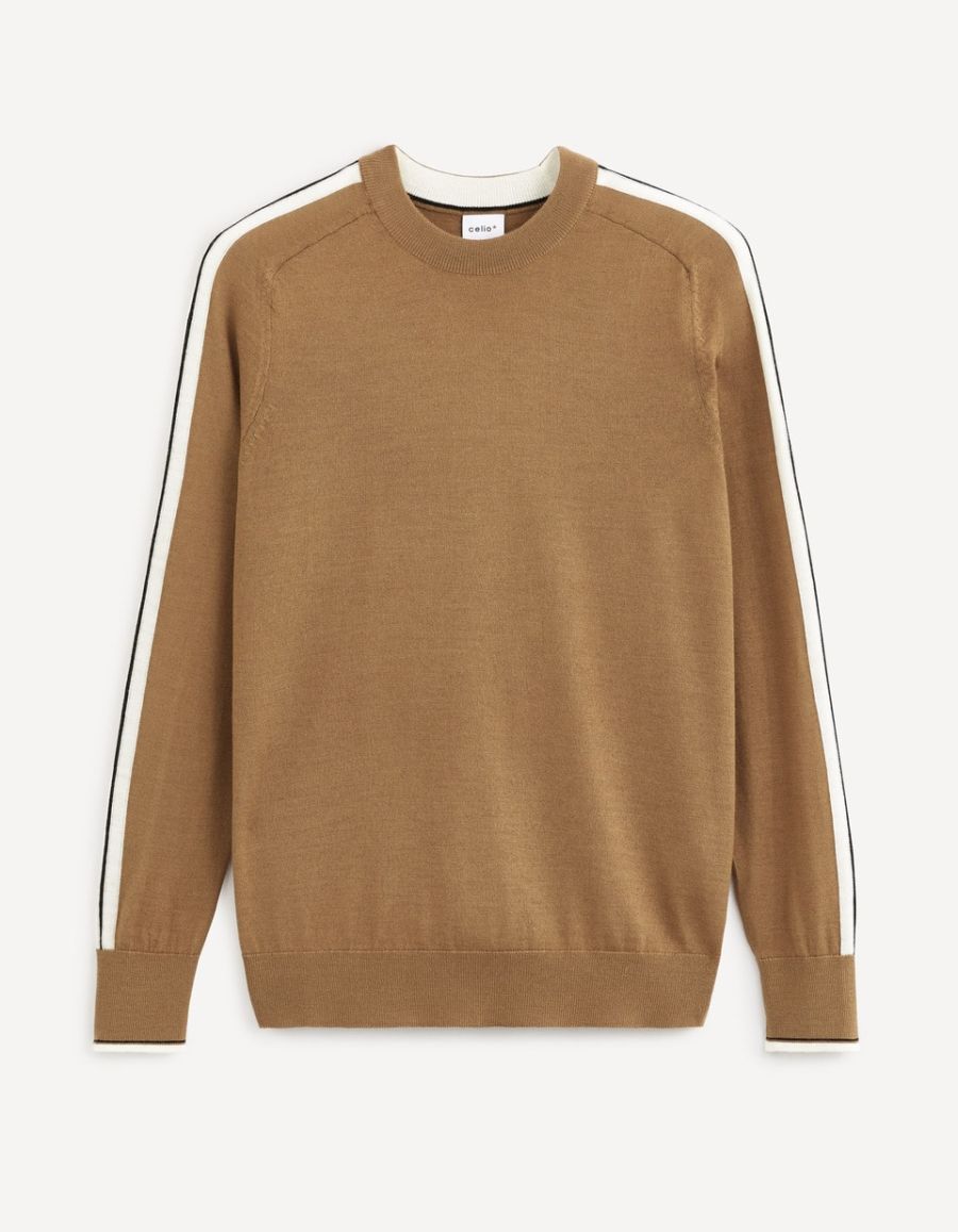 Pull col rond fantaisie pour homme , avec ses bandes contrastées sur les manches, il sera le pull mode de la saison. Avec un jean ou un chino pour un look décontracté ou chic.