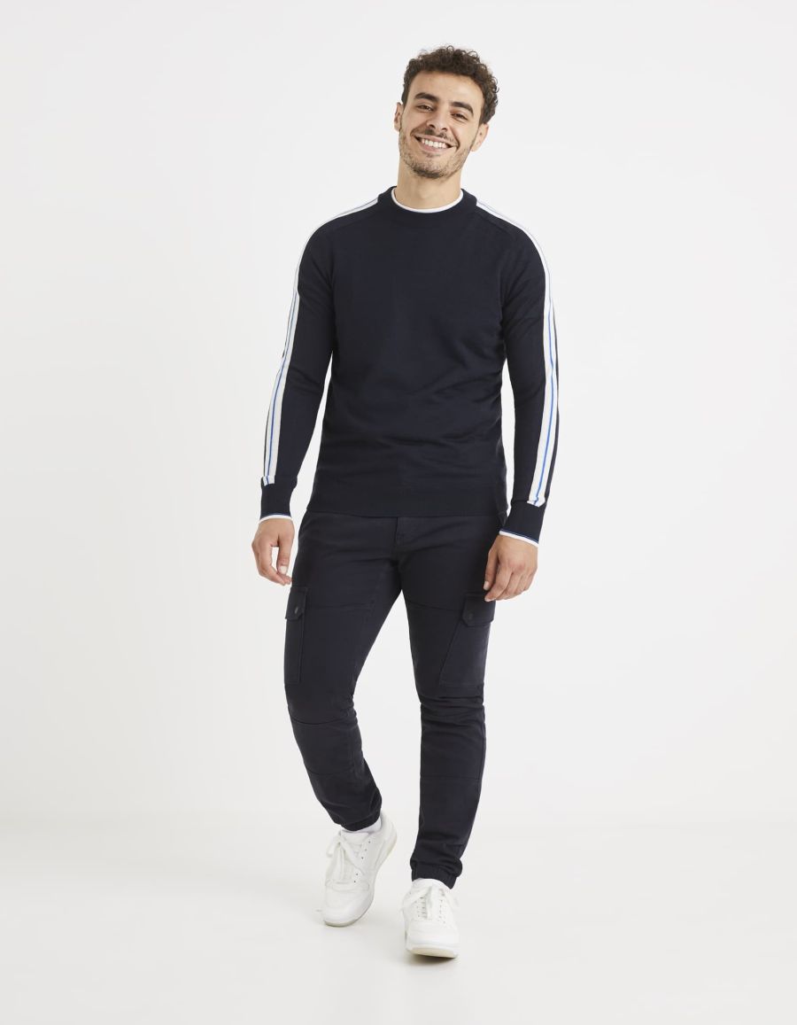 Pull col rond fantaisie pour homme , avec ses bandes contrastées sur les manches, il sera le pull mode de la saison. Avec un jean ou un chino pour un look décontracté ou chic.