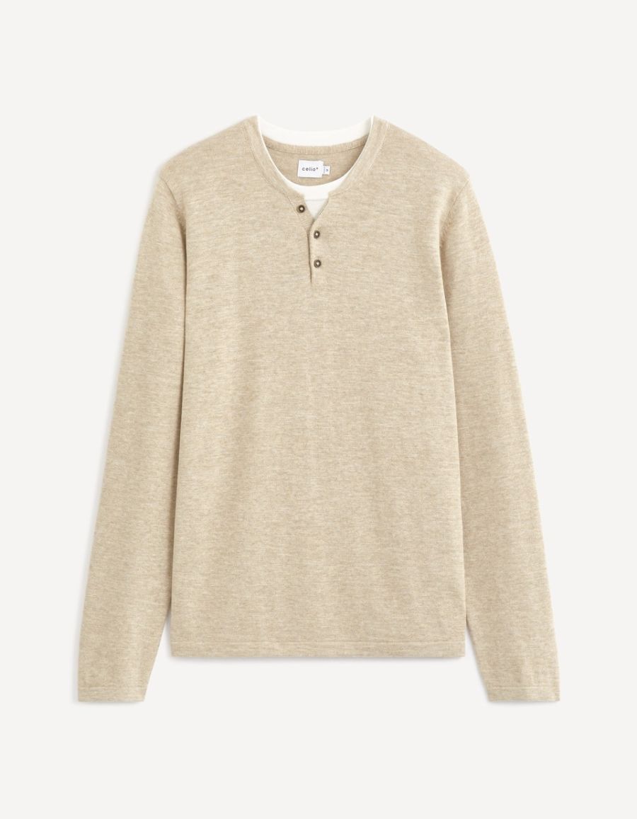 Ce pull pour homme apporte le détail qui change tout avec son col tunisien boutonné, ouvert sur un t-shirt blanc. Portez-le avec un pantalon chino et une paire de baskets, pour un look simple et décontracté. La composition est 100 % coton.
