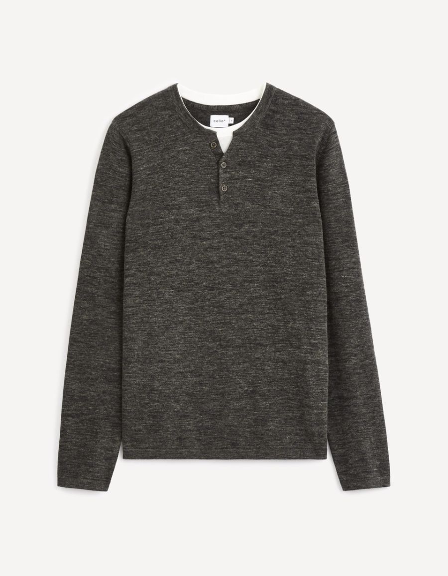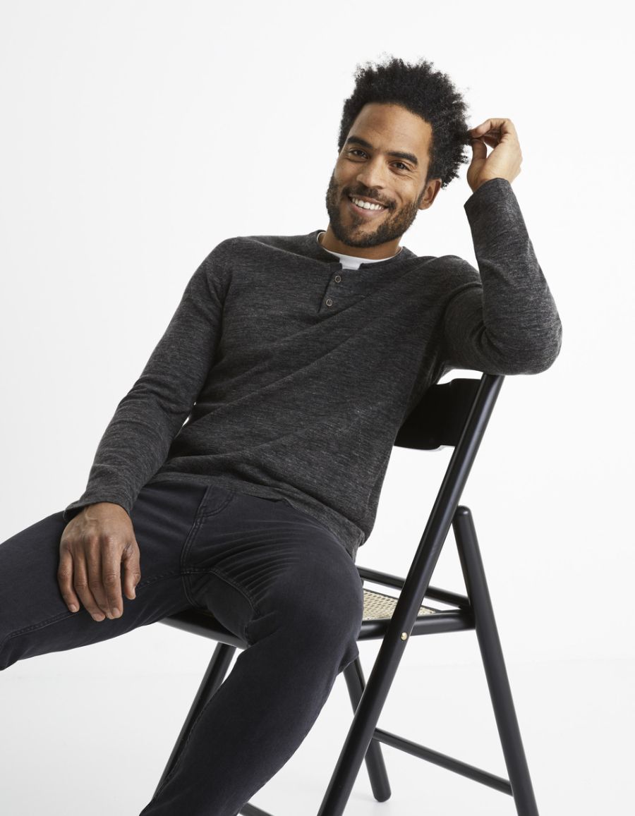Ce pull pour homme apporte le détail qui change tout avec son col tunisien boutonné, ouvert sur un t-shirt blanc. Portez-le avec un pantalon chino et une paire de baskets, pour un look simple et décontracté. La composition est 100 % coton.