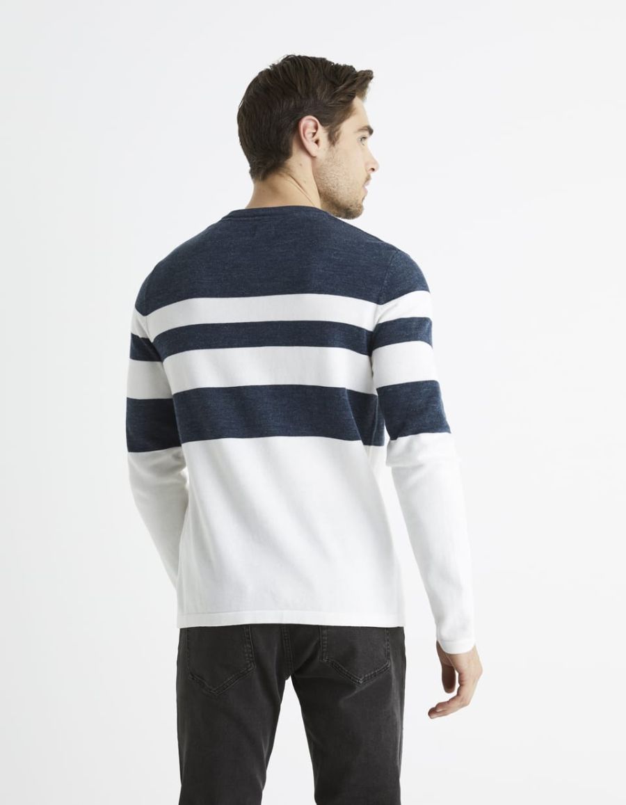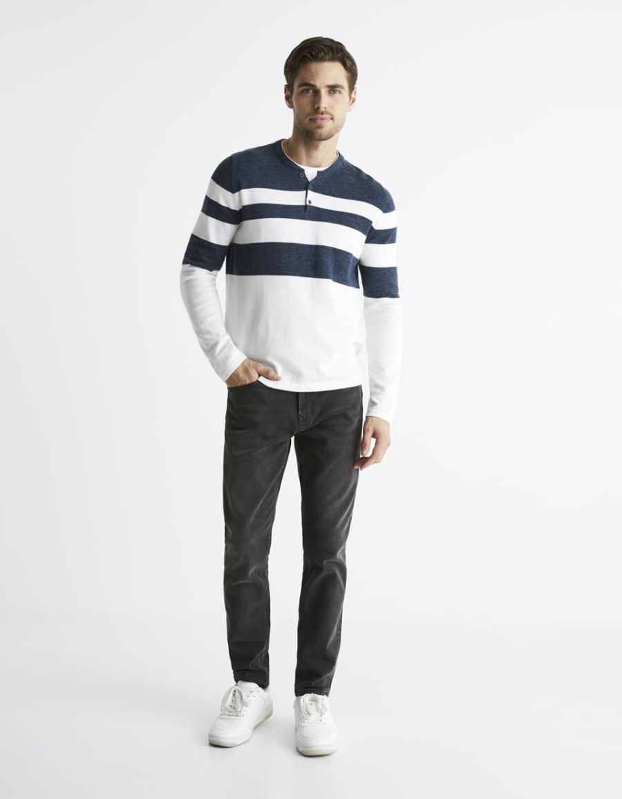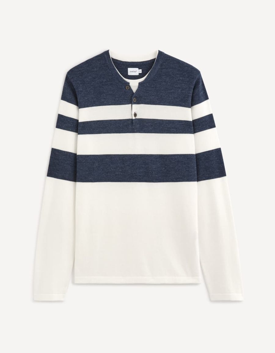 Toujours tendance, le pull à rayures est un indispensable du vestiaire masculin, accompagnant aussi bien un jean qu'un chino. Le col henley, boutonné et ouvert, de ce pull pour homme laisse voir un t-shirt blanc. La composition du pull est 100 % coton.