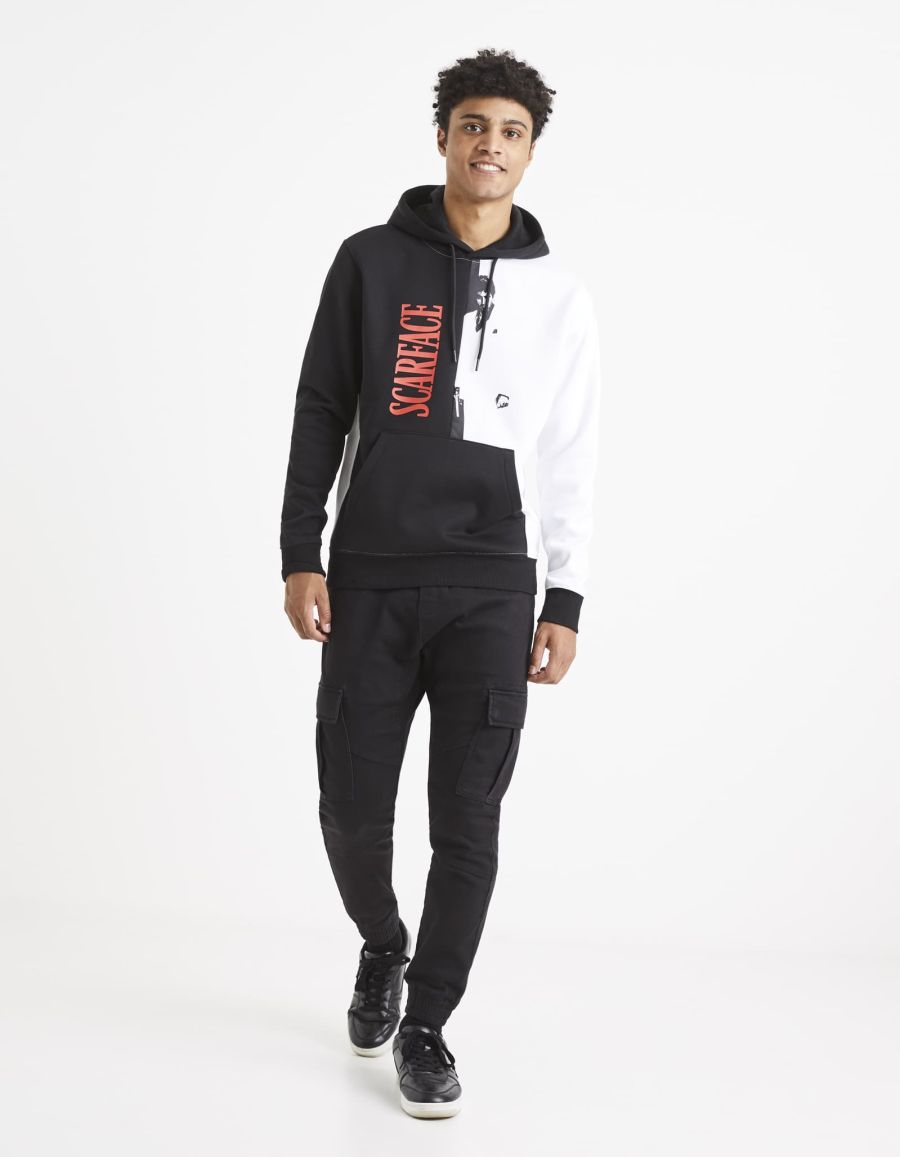 Osez l'originalité en portant ce sweat bicolore: une moitié du vêtement est blanche, l'autre est noire. Au centre du vêtement, on retrouve Tony Montana imprimé à côté du nom "Scarface", célèbre film des années 80 de Brian de Palma. Ce sweat pour homme pos