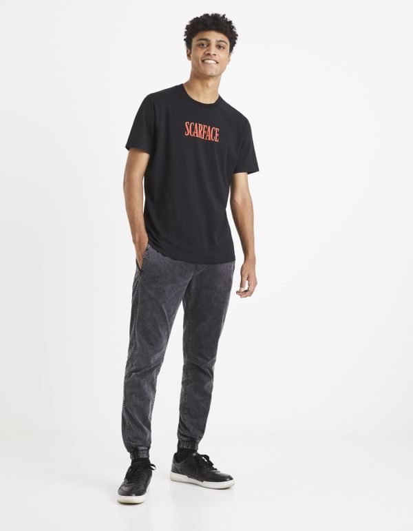 Le nom du film culte "Scarface" est imprimé sur le devant et l'arrière du t-shirt. On retrouve également une scène mythique du film avec Tony Montana, joué par Al Pacino, imprimée en noir et blanc sur le dos du vêtement. Ce t-shirt noir pour homme possède