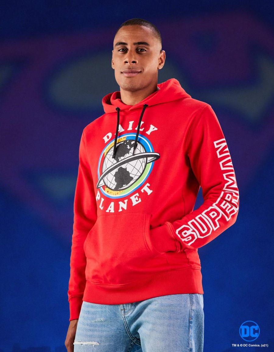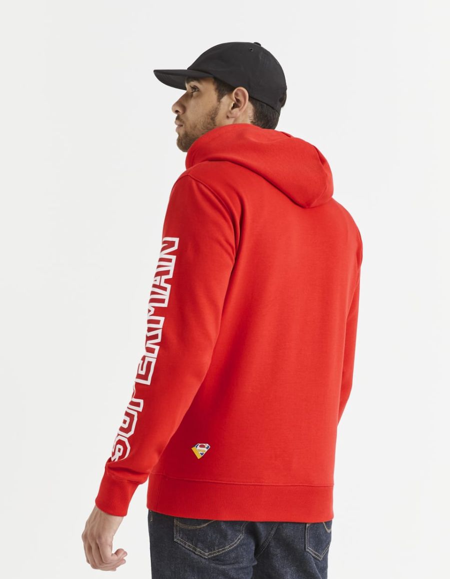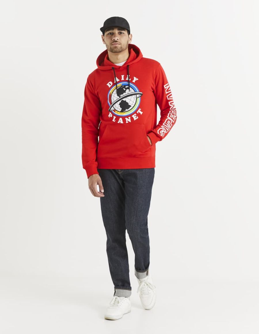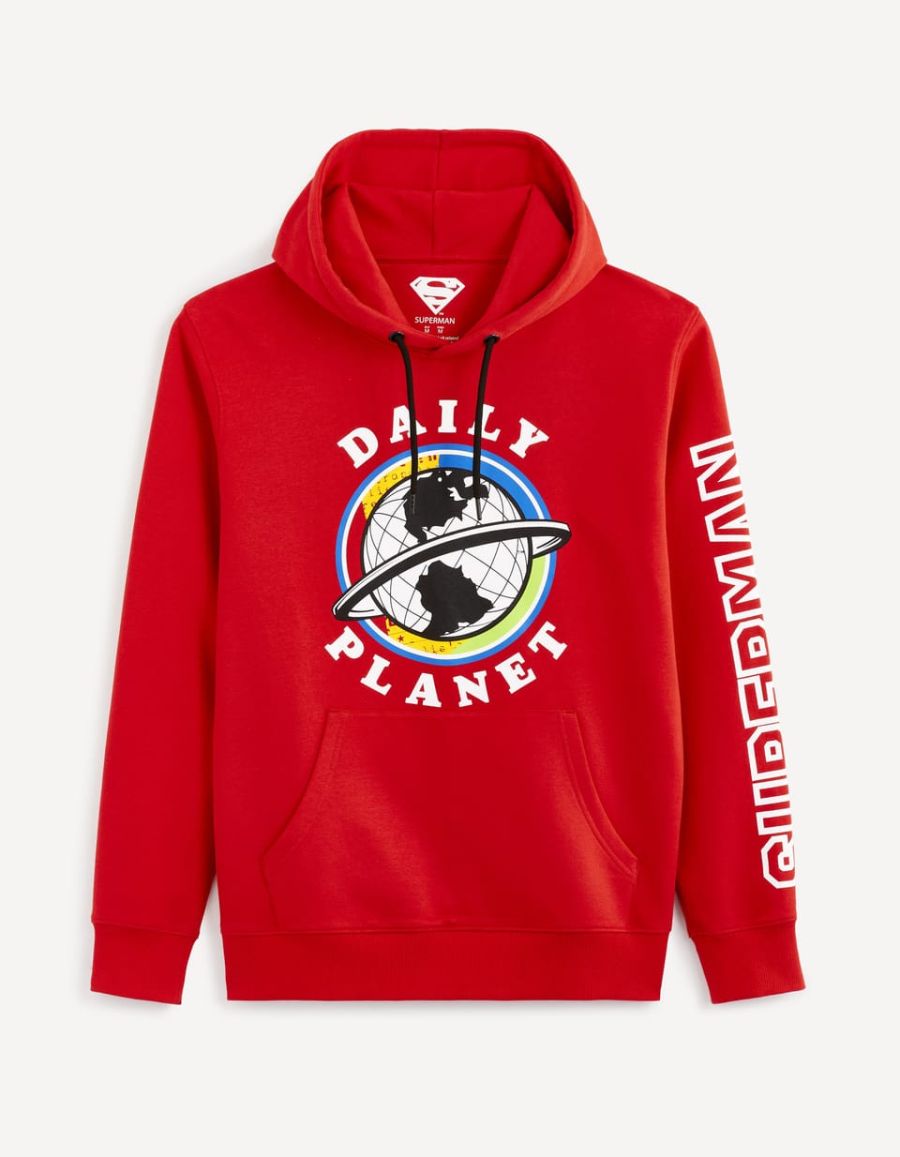Ce sweat rouge en coton mélangé met à l'honneur The Daily Planet, un quotidien publié dans l'univers imaginaire de Superman, dans la ville de Metropolis. Il est muni d'une capuche, de manches longues et d'une poche ventrale.