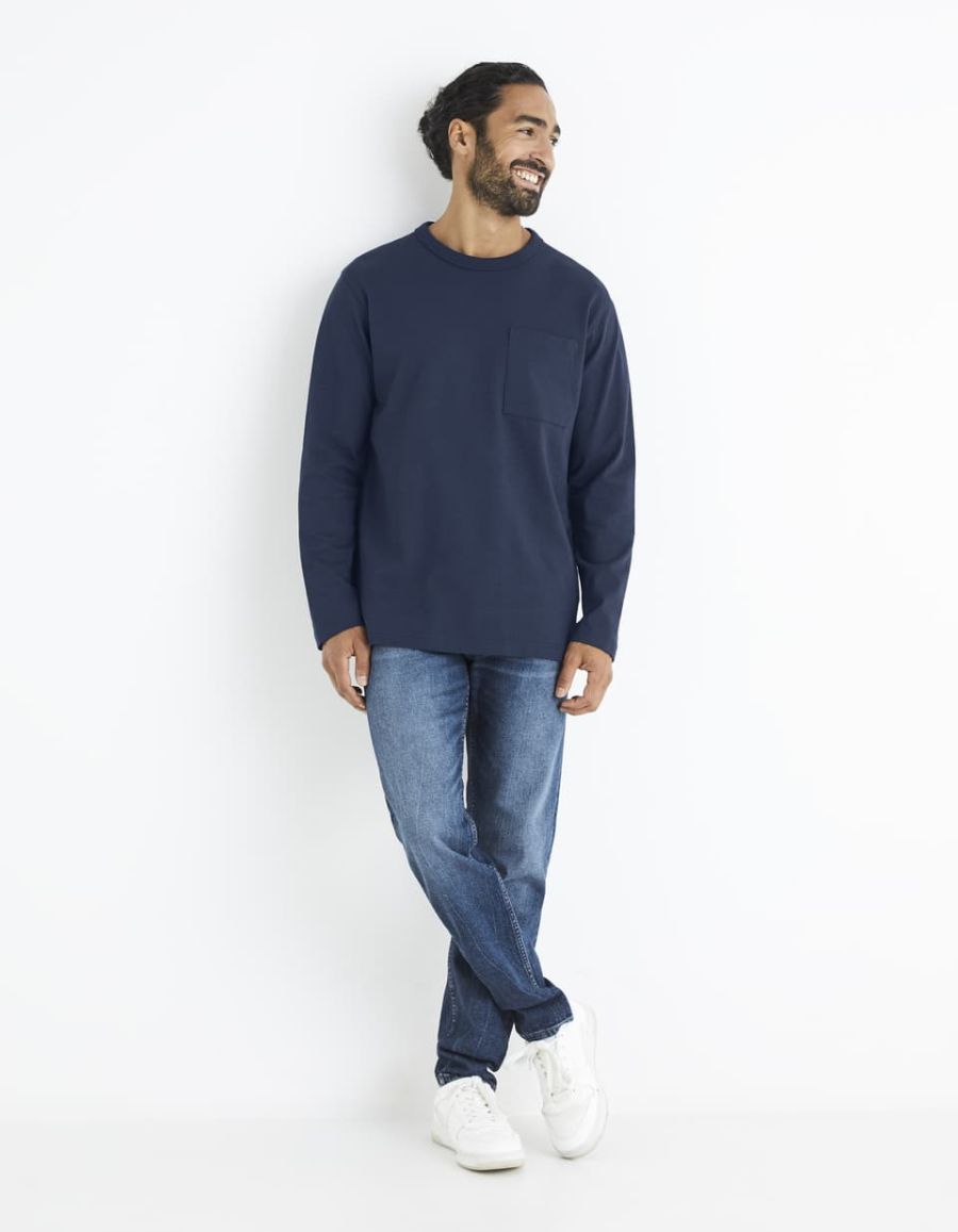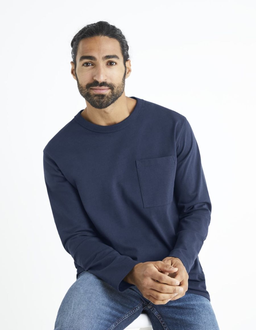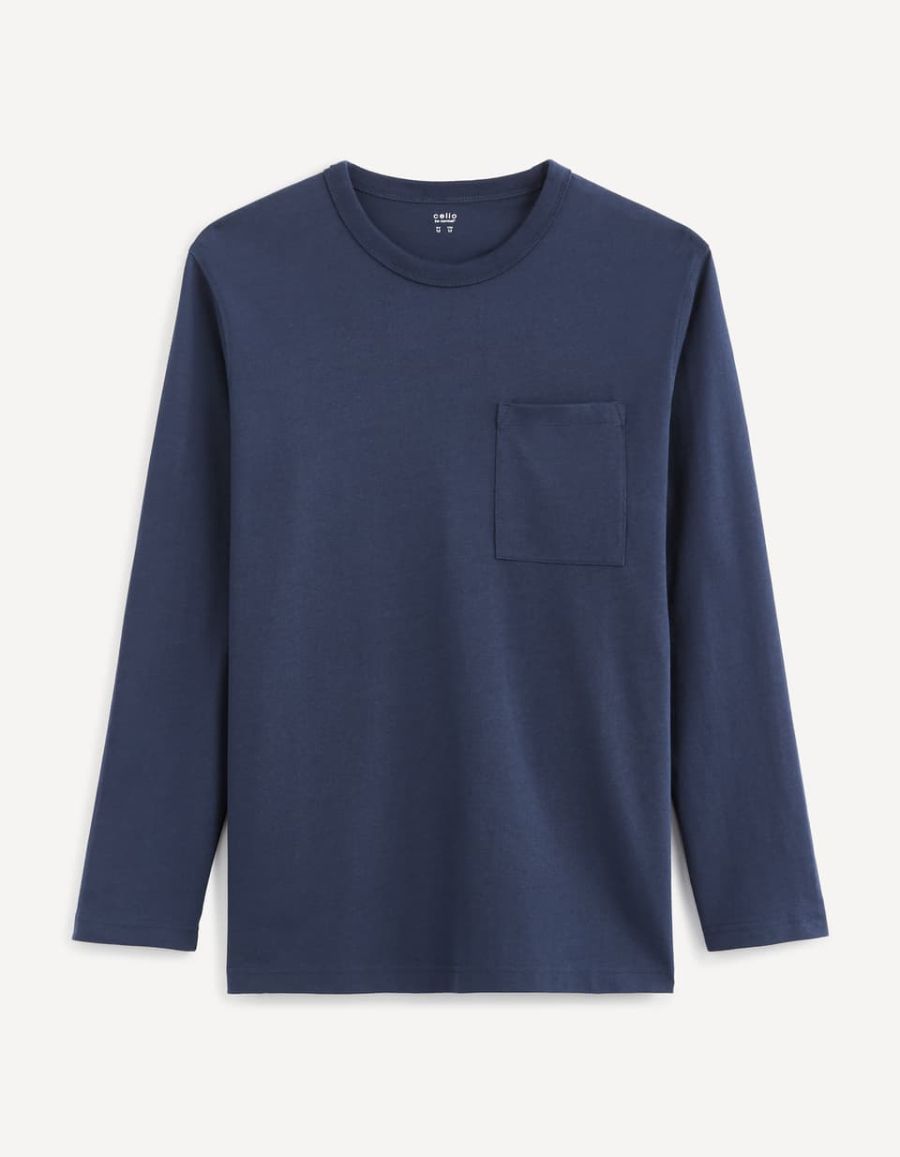 Adoptez le confort de ce t-shirt manches longues pour homme 100 % coton. Vous pourrez le porter directement sous une veste casual, avec un jean ou un chino. Le t-shirt a un col rond et est équipé d'une poche placée sur la poitrine.