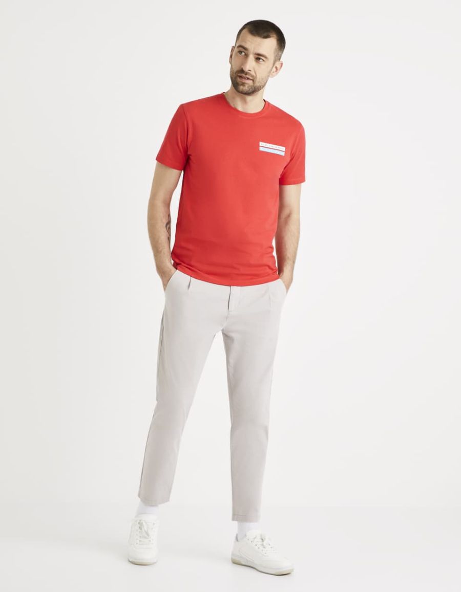 Facile à assortir, ce t-shirt pour homme ira très bien avec un pantalon chino, mais aussi un jean. Il est agrémenté d'un motif imprimé discret au niveau de la poitrine. Son col est rond et sa composition est 100 % coton.