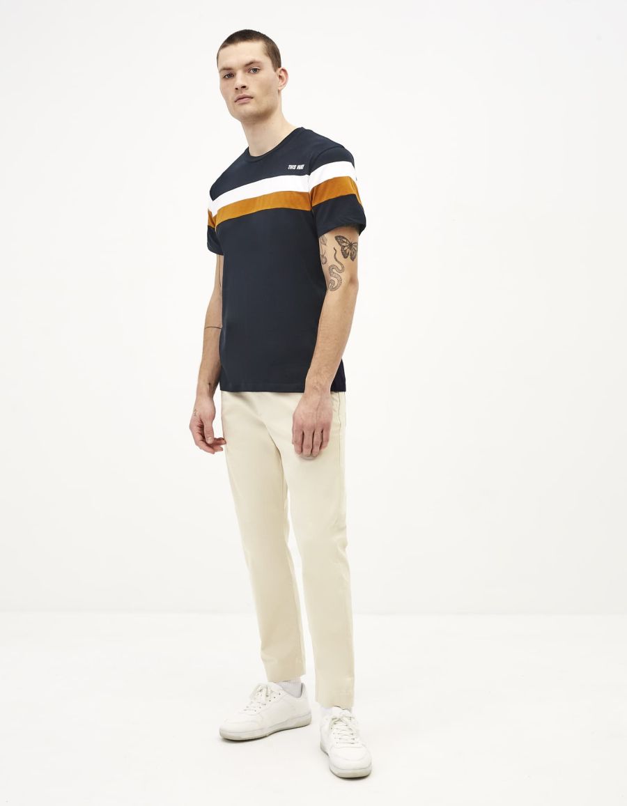 Parfait pour un look décontracté, ce t-shirt homme accompagnera facilement un chino et des baskets. Ses bandes colorées qui traversent la poitrine apporteront le petit détail qui change tout à votre tenue. Le t-shirt est 100 % coton, avec des manches cour