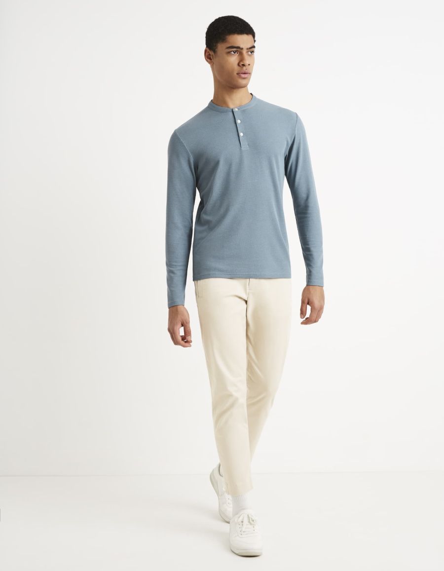 Ce t-shirt pour homme basique et confortable sera facile à assortir à un pantalon en toile. Le t-shirt a des manches longues et un col rond avec des boutons. Sa composition est en coton mélangé.