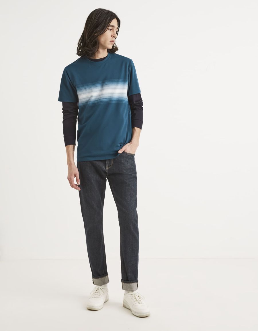 Le dégradé que forment les bandes traversant ce t-shirt pour homme rappellent l'effet que l'on retrouve avec le tie & dye. Il pourra facilement être assorti à un pantalon en toile ou un bermuda, et apportera une touche tendance à une tenue décontractée.