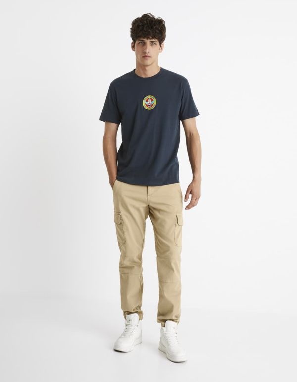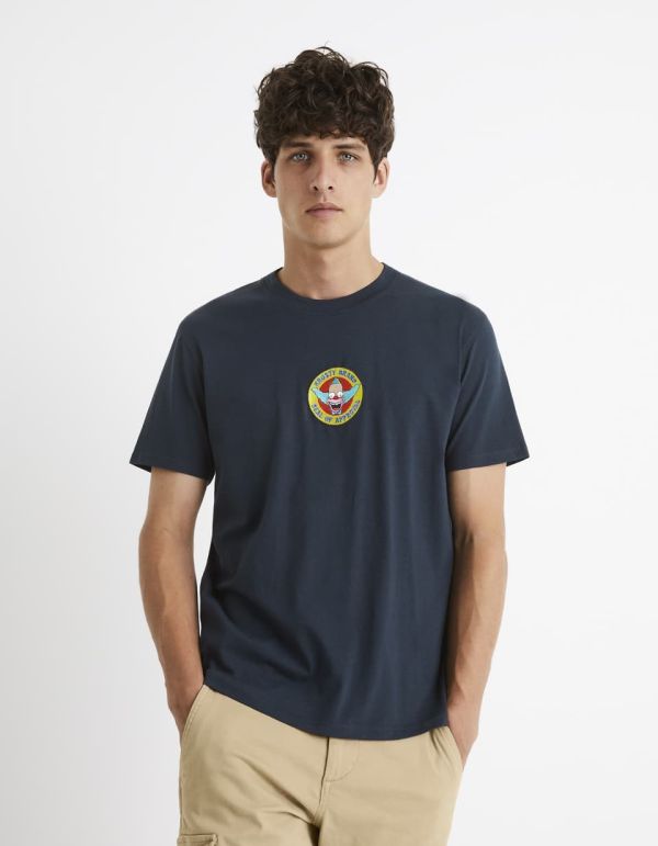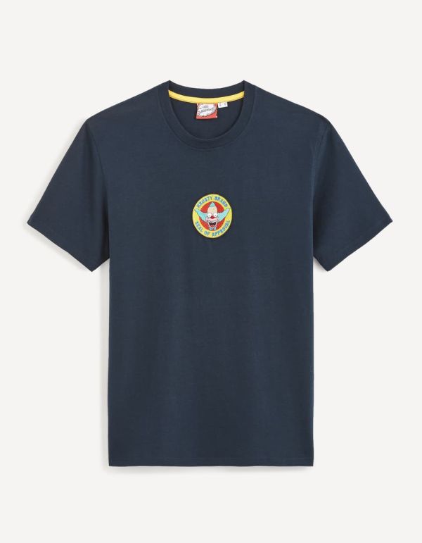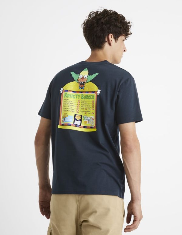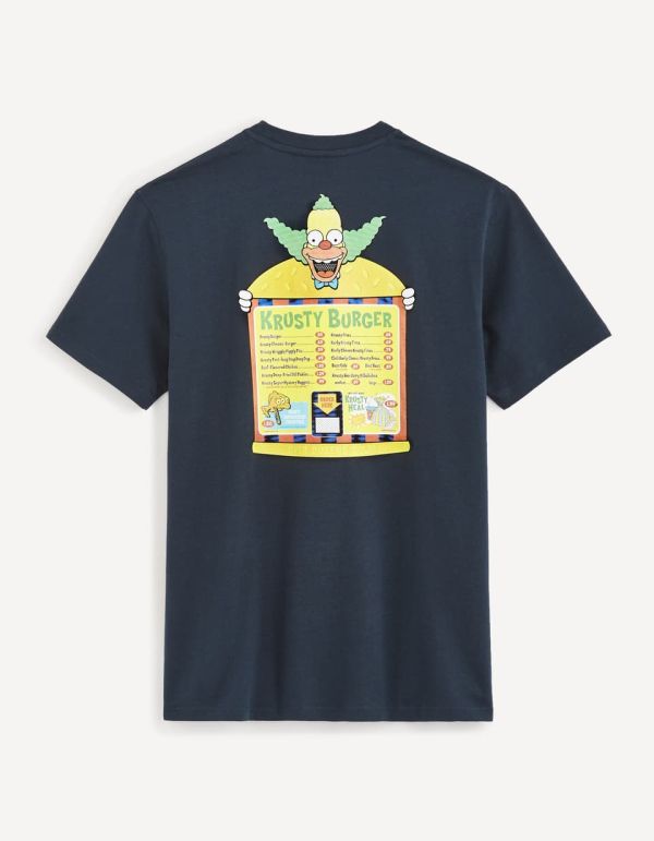 Ce t-shirt bleu marine pour homme est à l'effigie de Krusty le Clown avec, au dos, le menu complet de burgers, indispensable pour regarder son show. Ce t-shirt pour homme de la collection celio x The Simpsons possède des manches courtes, un col rond et a